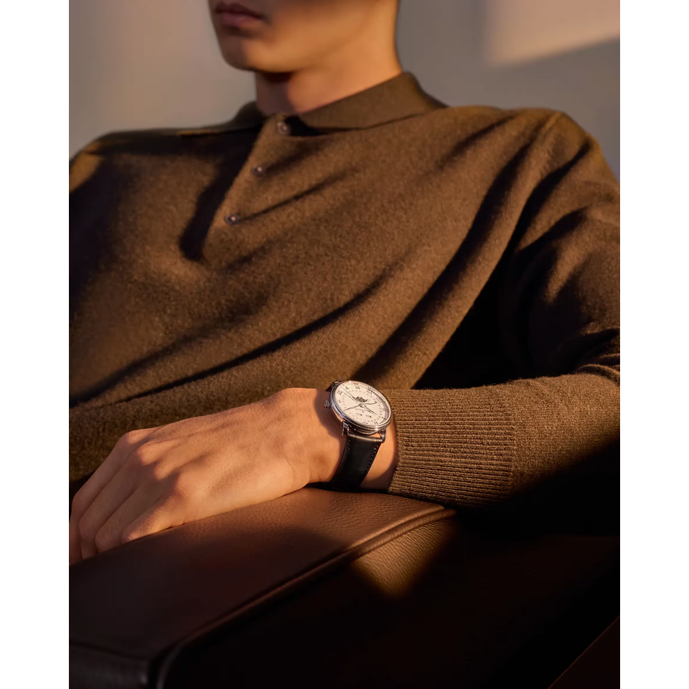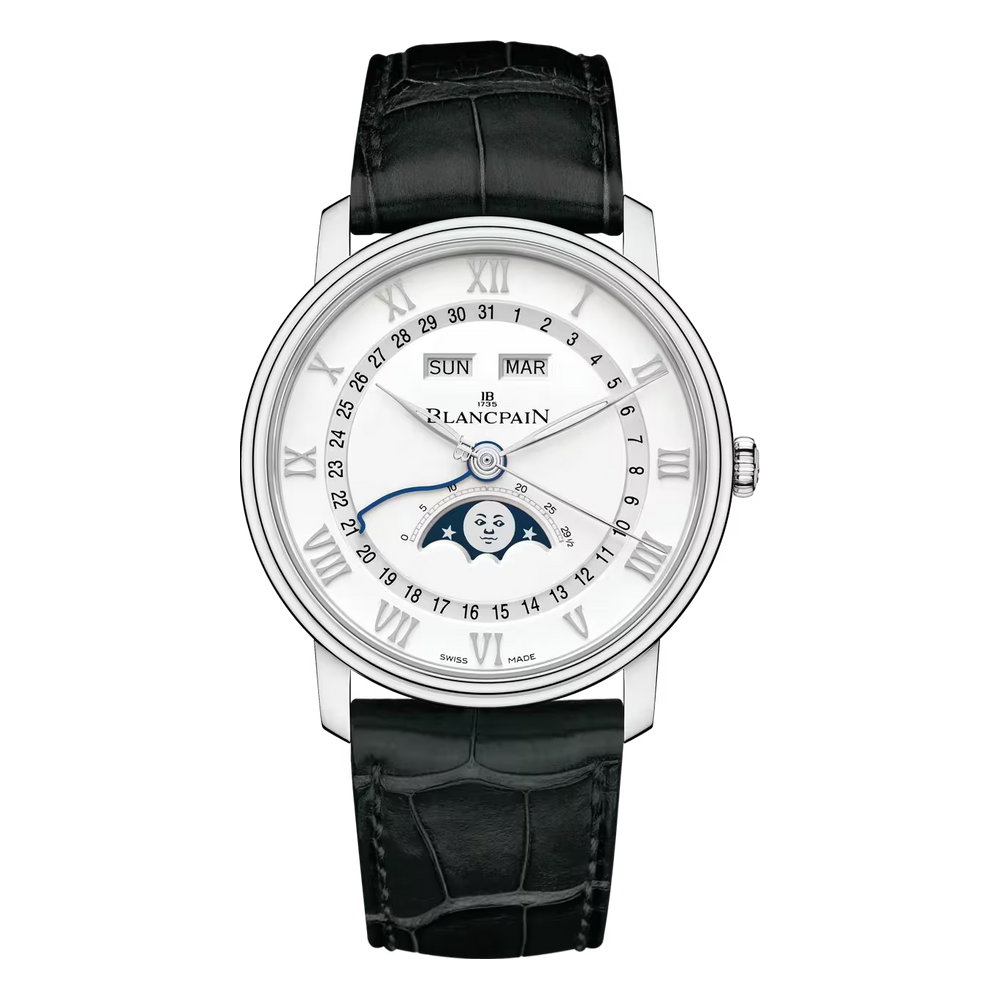 A moon phase complication tracks the 29.5-day lunar cycle with a rotating disc beneath the dial, driven by a 59-tooth wheel. It blends function with poetry. Blancpain is renowned for refining this feature, combining precision, tradition, and elegance in every moonlit display.