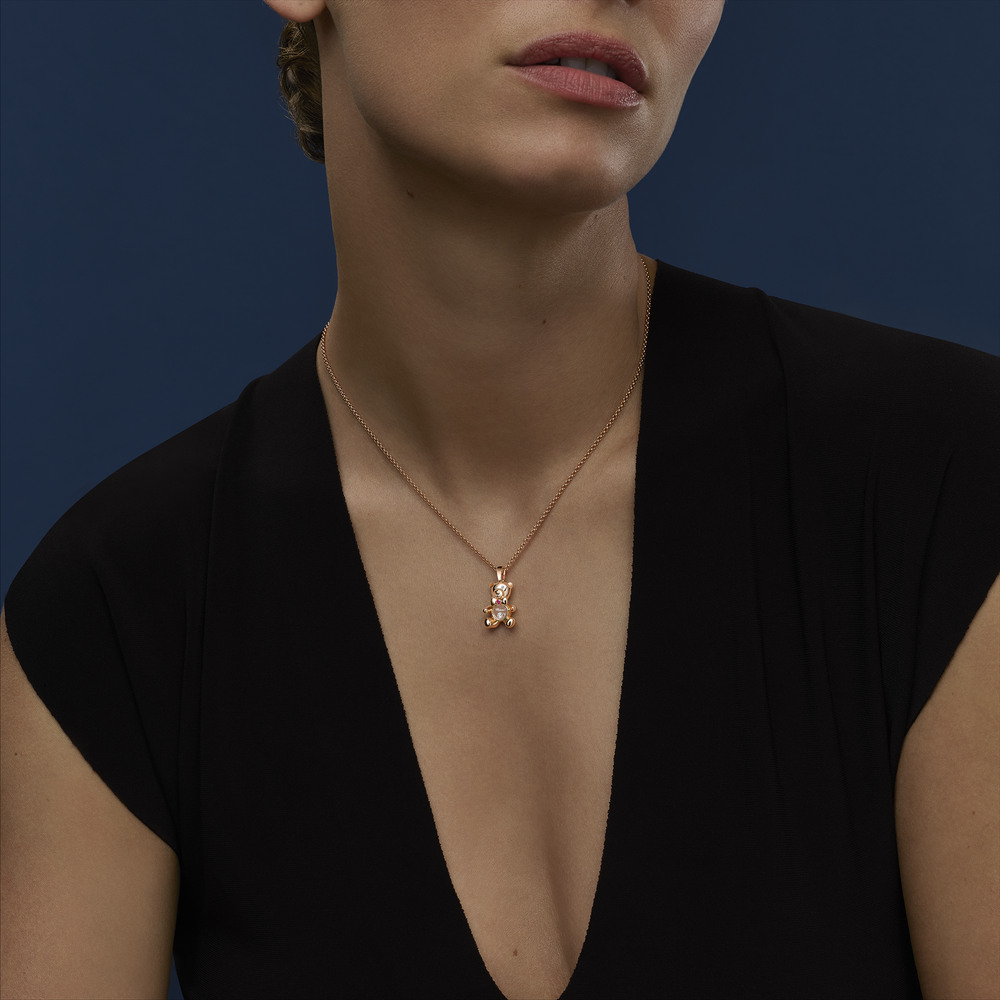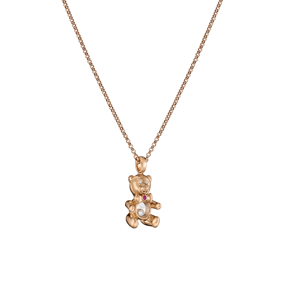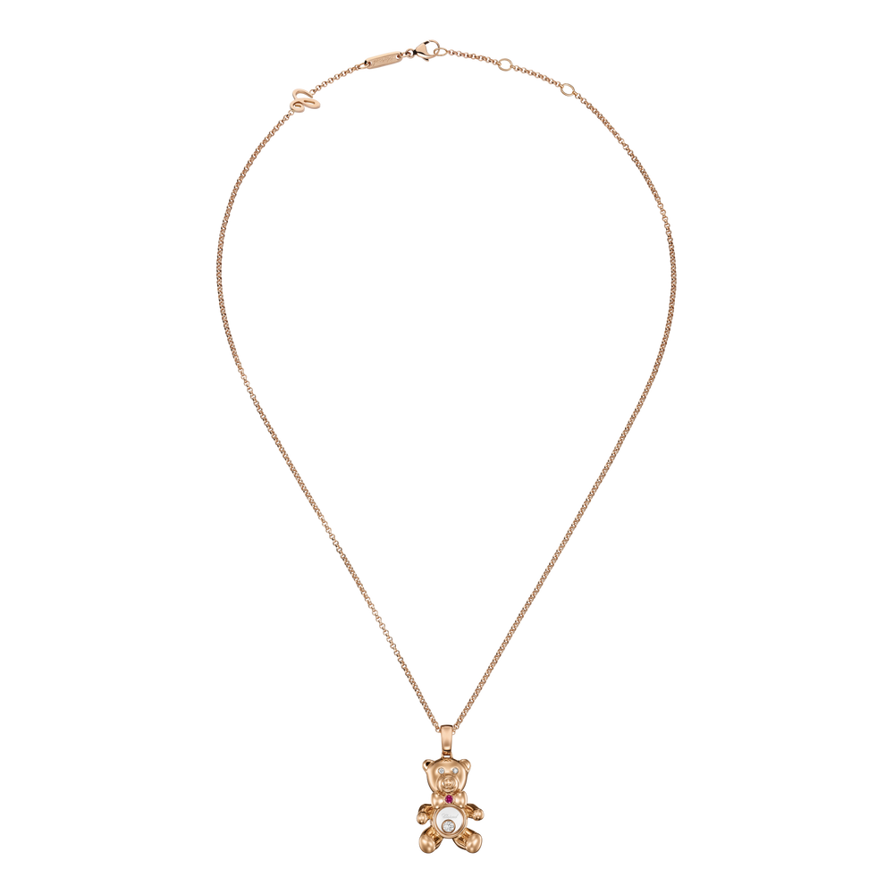 Soft, round curves. Universal symbols. Dancing diamonds. In the pure tradition of Happy Diamonds creations, enter this little lucky-charm animal. A teddy bear in ethical 18-carat rose gold, interpreted with great tenderness and designed to be worn as a pendant, close to the heart. Little Diamonds Do Great Things