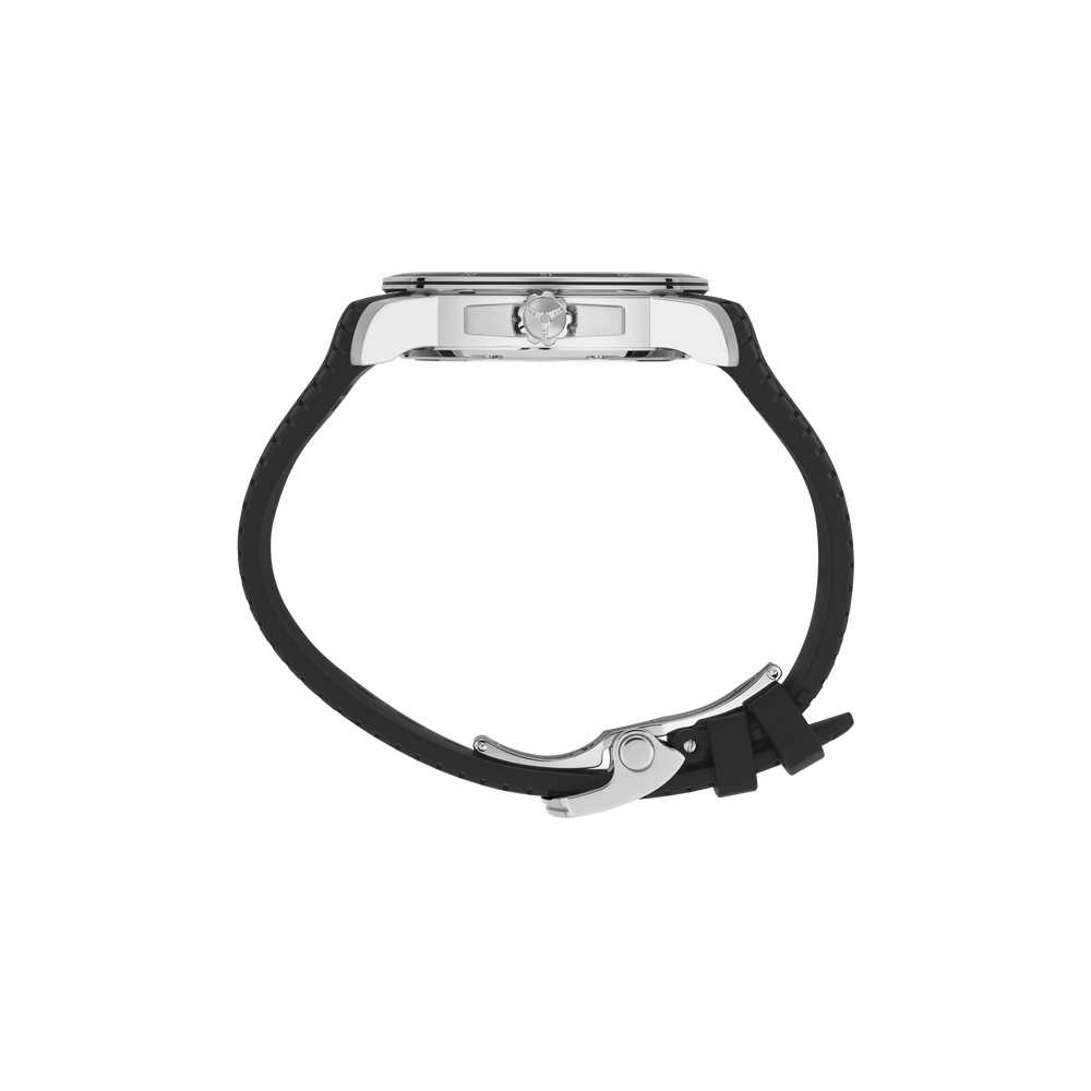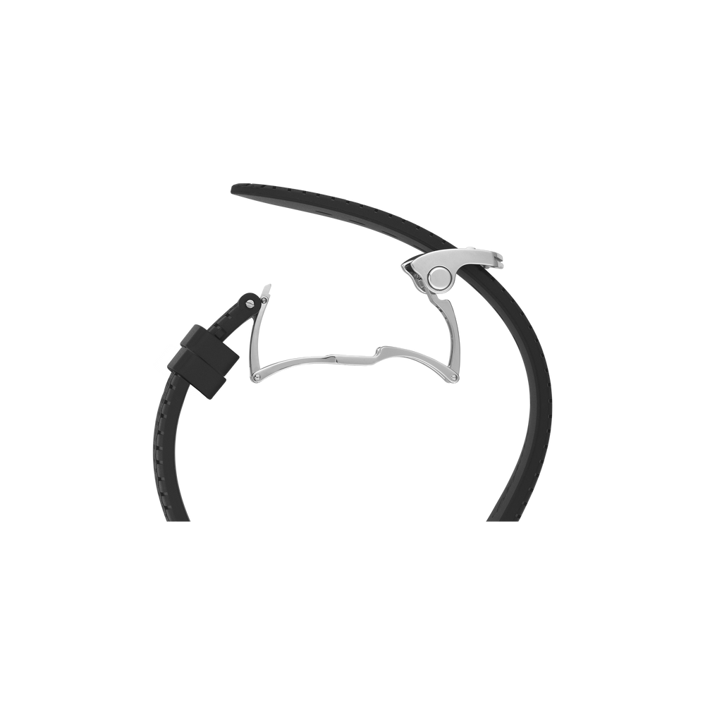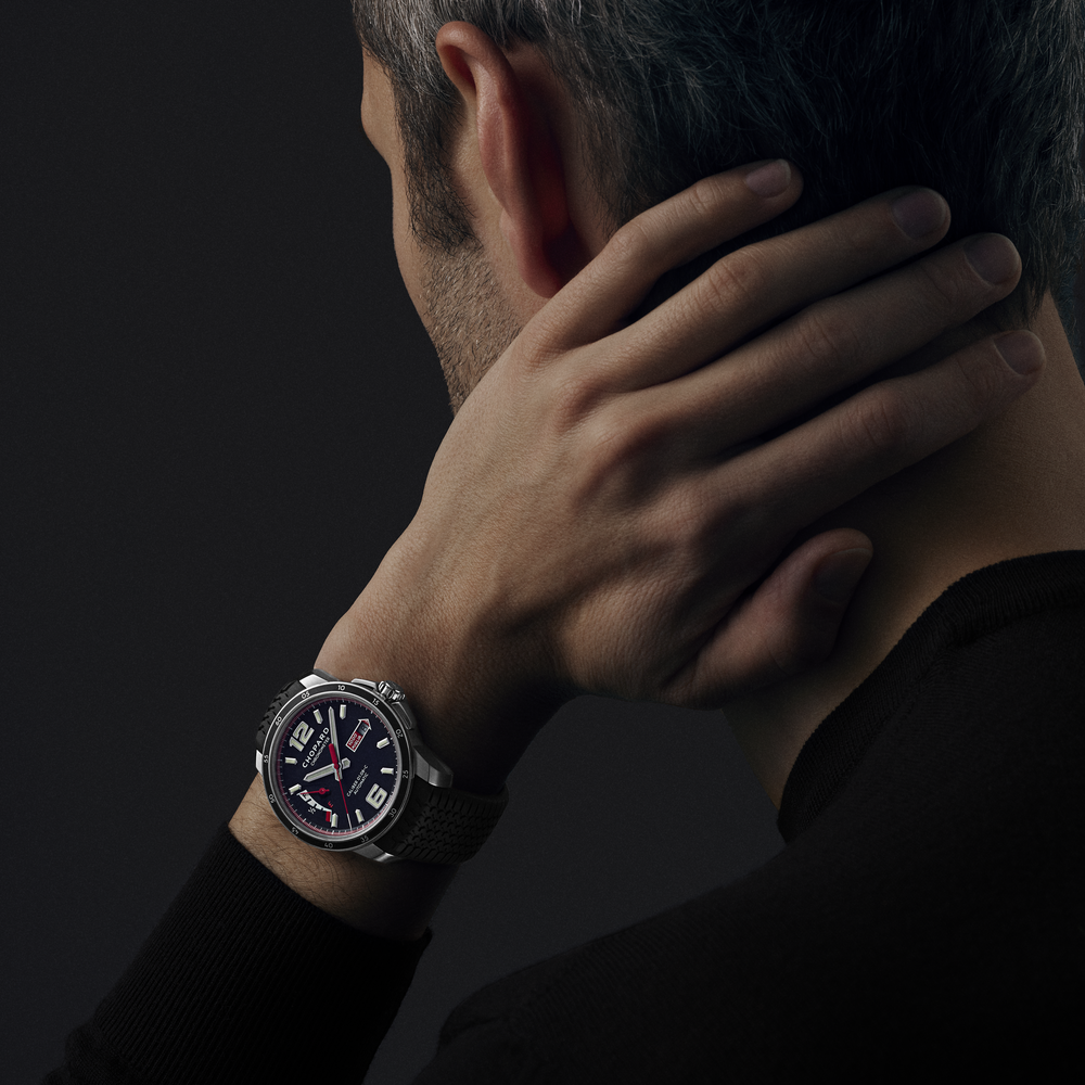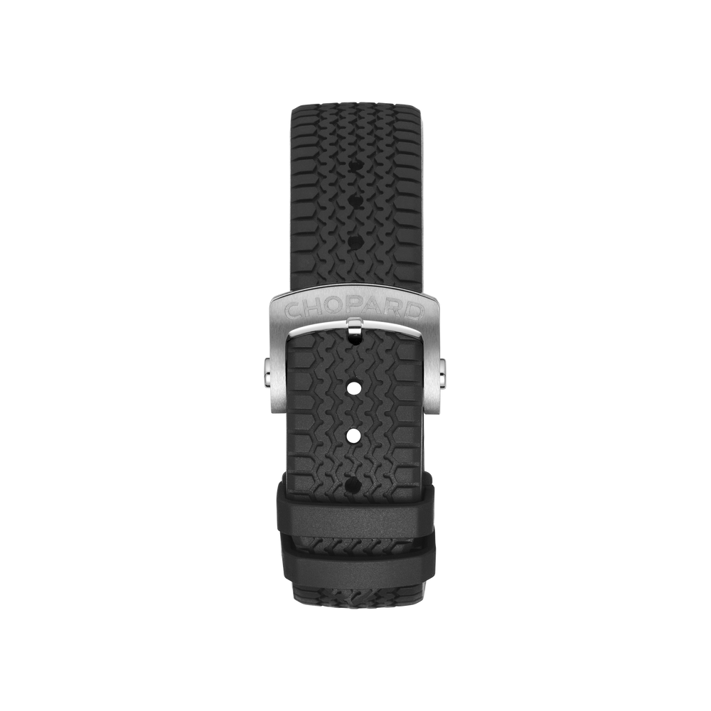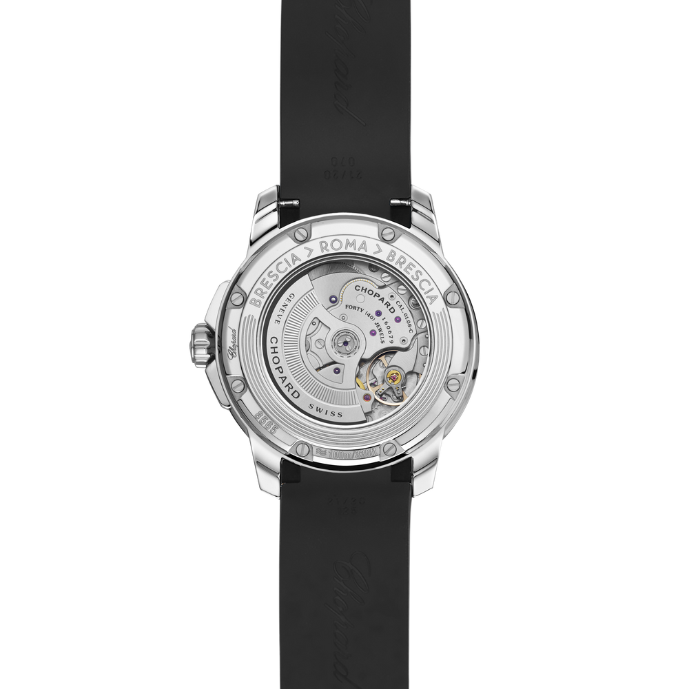 Power, resistance and aesthetics come together in the Mille Miglia GTS Power Control, a resolutely masculine timepiece bearing all the hallmarks of Chopard expertise. Housing the self-winding Chopard Caliber 01.08-C and beating at a frequency of 28,800 v.p.h, this Lucent Steel™ watch on a rubber strap features an emblematic black dial with a power-reserve indicator at 9 o'clock. Chronometer certified by the COSC, the movement is equipped with a stop-seconds function allowing precise adjustments. Water-resistant to 100 meters, the 43mm case is equipped with an anti-reflective, scratch-resistant sapphire crystal. The movement, driven by a tungsten oscillating weight, can be admired through the sapphire crystal case back.