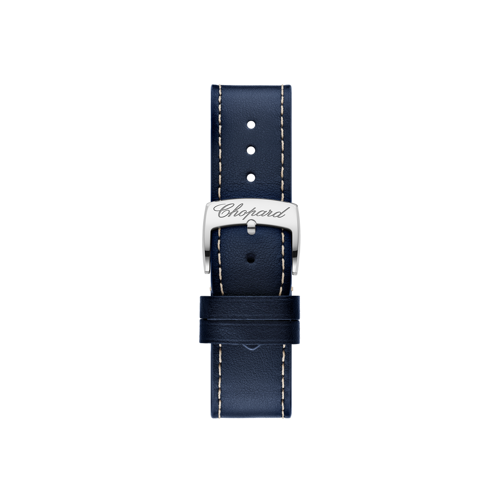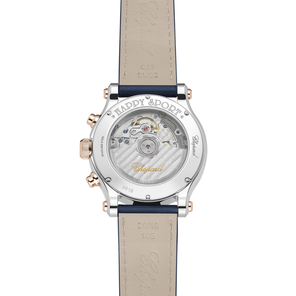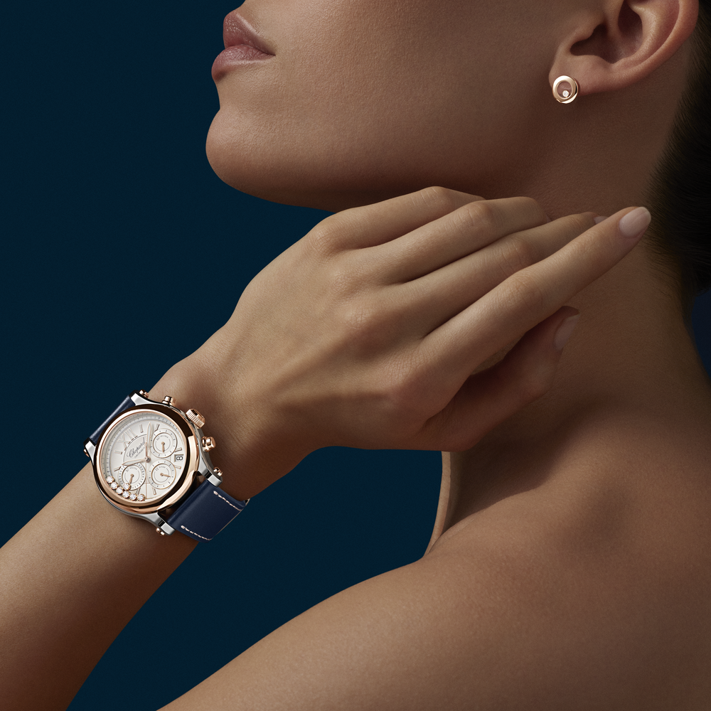 Sporty by nature and ethical in essence, this bold 40-millimeter luxury watch has it all. Its seven mobile diamonds twirl on an elegant gold dial in a case in ethical 18-carat rose gold. The Happy Sport Chrono diamond watch is powered by a high-precision chronograph movement chronometer-certified by the COSC and guaranteeing a 54-hour power reserve. This luxury chronograph watch for women is fitted with a midnight blue leather strap that contributes to its chic and casual look. Little Diamonds Do Great Things.