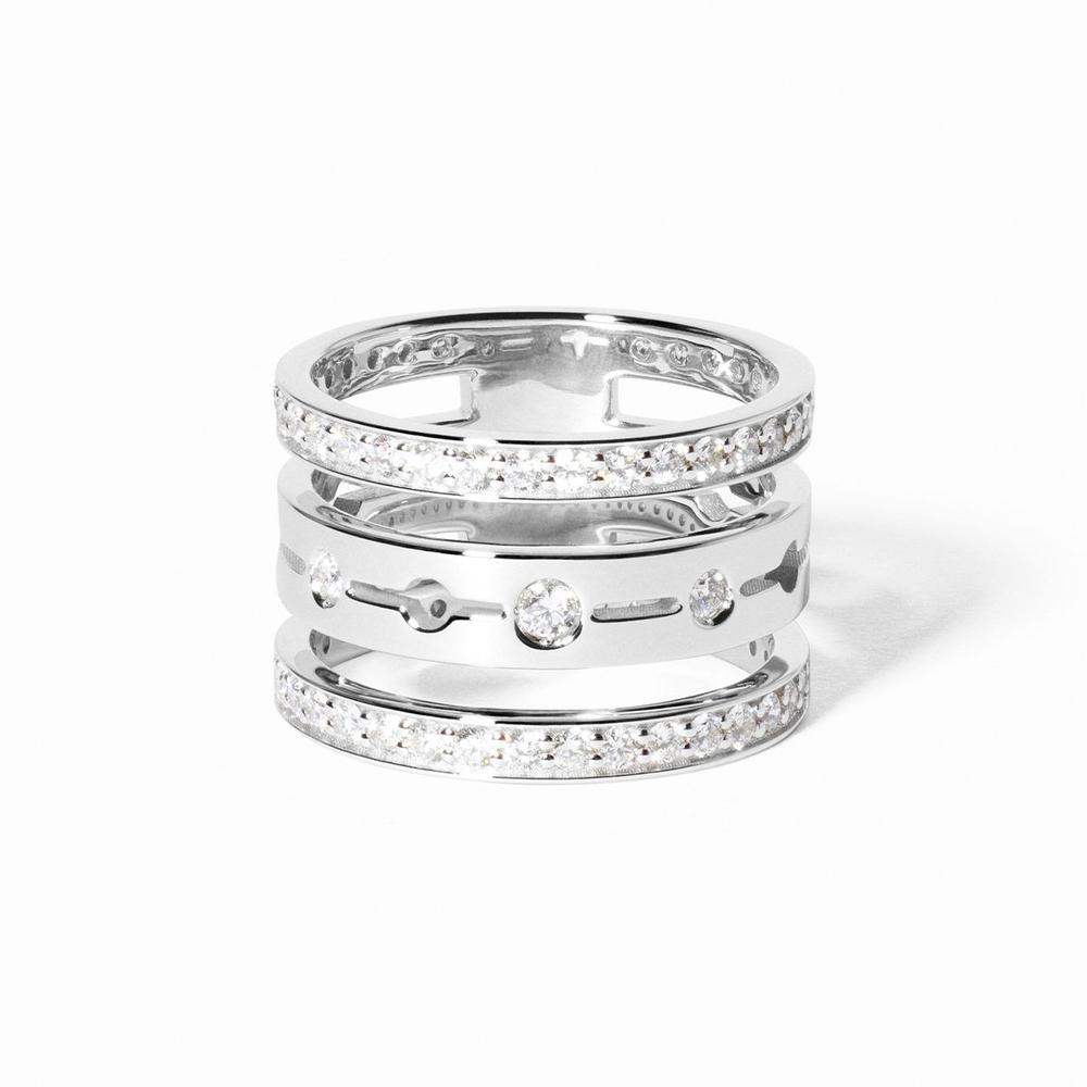 Pulse paved 3 rows ring in 18k white gold and diamonds. When the vibrant aura of diamonds embraces the graphic lines of gold, discover the Pulse 3 rows ring in a pavé version.