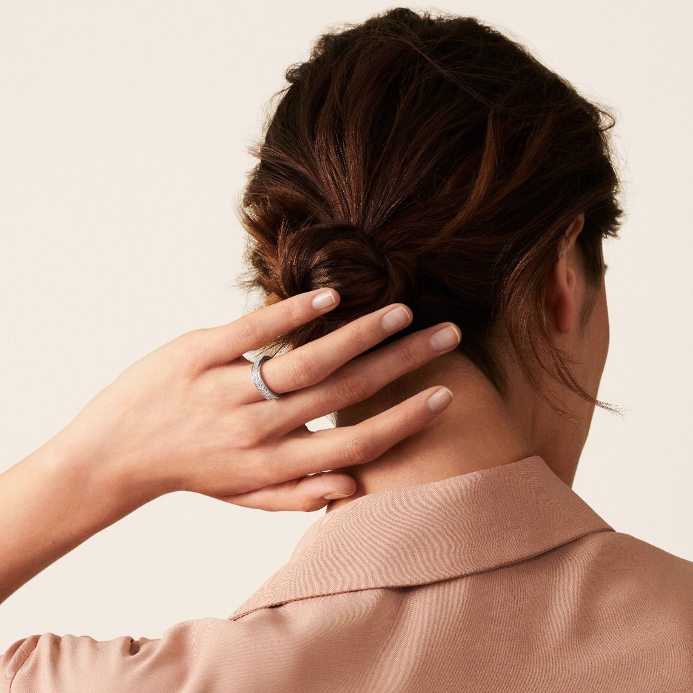 The square ring, signature of the Maison dinh van, is available in a half paved diamonds version, elegant and modern.