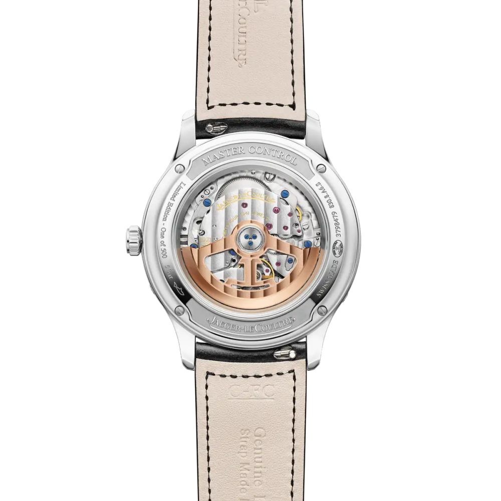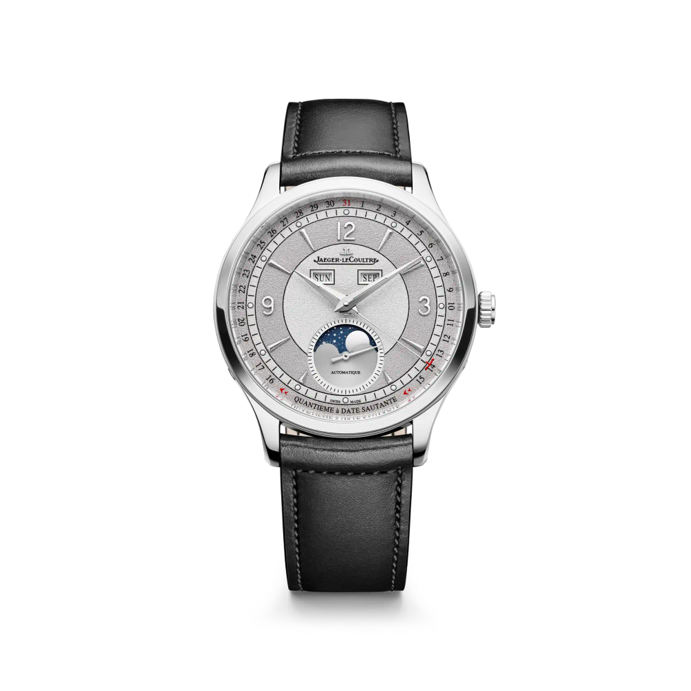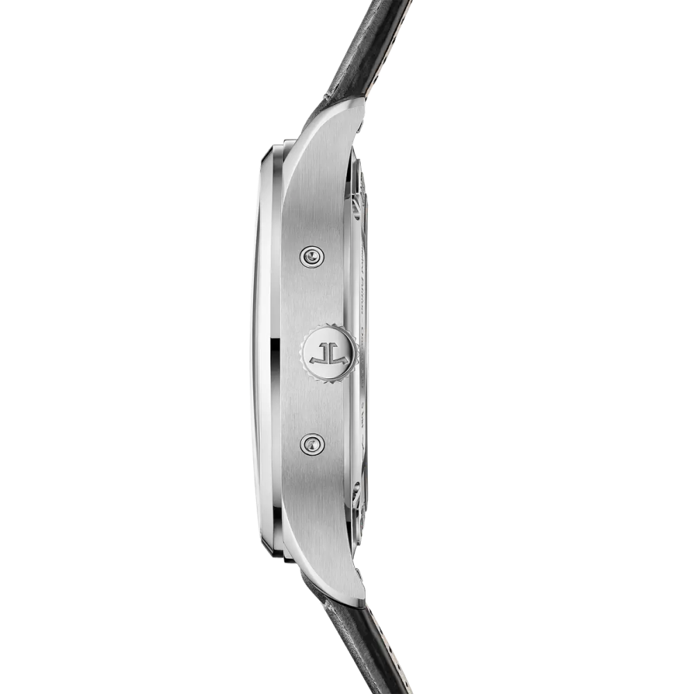 On the 2025 Master Control Calendar limited edition, the finish of the dial catches the eye with its elegant interplay of textures and tones: a refined grained surface alternates between two shades of grey arranged in concentric rings, lending depth and sophistication to the display. The day and month discs follow suit in matching grey, creating a harmonious and modern aesthetic. These subtle contrasts come alive under changing light, while the dots of the minute track and Dauphine hands, coated in Super-Luminova®, glow discreetly in the dark. On this signature display, the jumping date between the 15th and 16th day stands out, made recognizable by its anchor-shaped tip – a subtle reminder of the Maison’s logo – finished in bright red. This small detail of great refinement facilitates reading of the indications. Capture all the nuances of time with this resolutely contemporary watch, created in a limited edition of 500 timepieces.