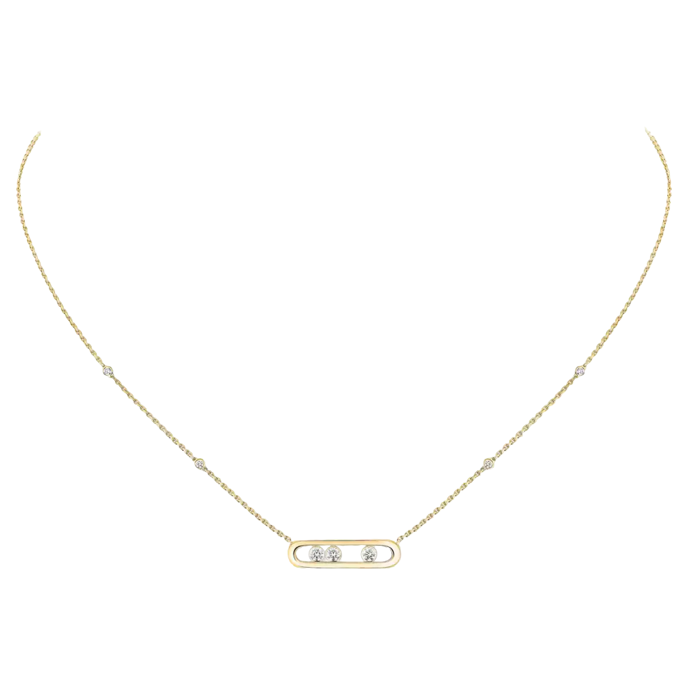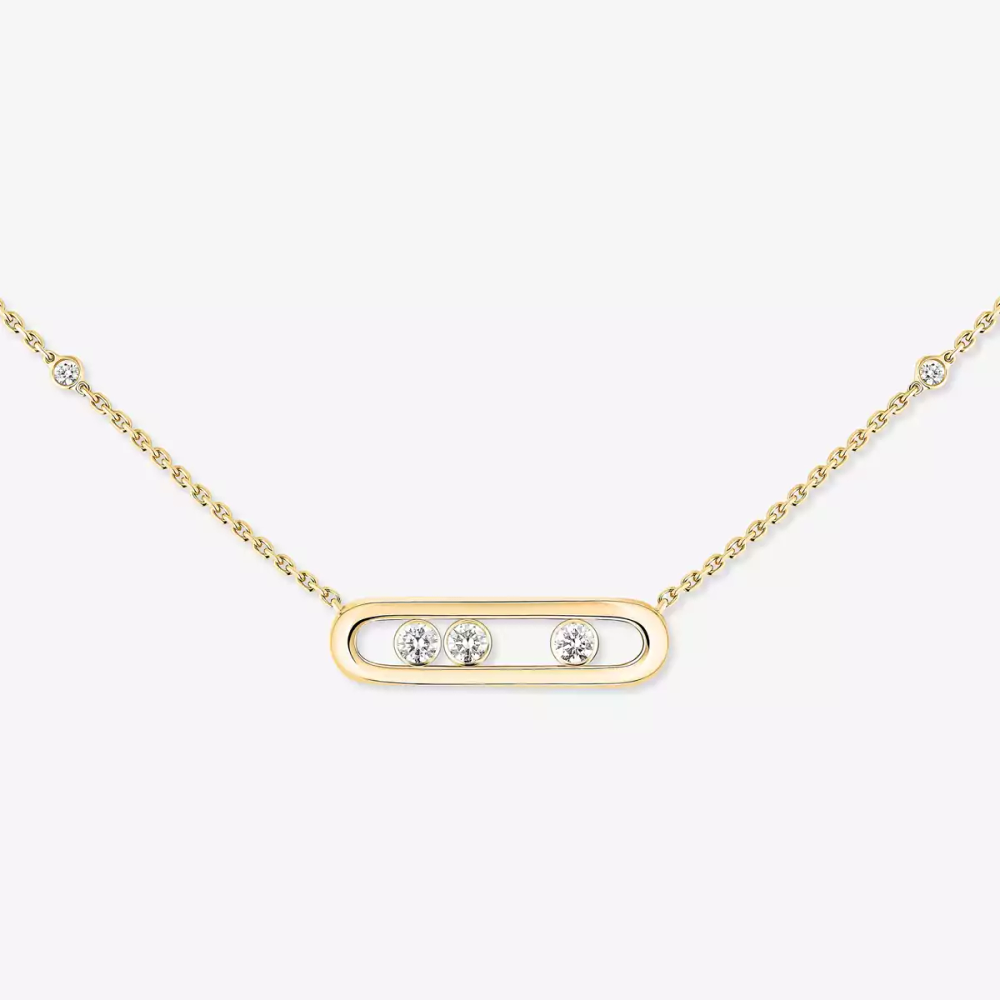 Once left behind, the yellow gold has been coming back for two years. It particularly suits the pretty matt and tanned skins, enlighting them with their amazing solar color. This 18 carat yellow gold diamond necklace, fully handcrafted is part of the iconic Move diamond jewelry collection of Messika House will set down at the neckline with finesse. The three moving 0.03 carat diamonds, symbols of the love of yesterday, today and tomorrow, shine according to one's movements. This diamond jewel for women will smartly suit a casual shirt or a cocktail dress. A chic detail on this yellow gold diamond necklace: the adorning diamonds on the chain. Let be seduced by Messika's yellow gold diamond necklace Baby Move and discover online unique diamond jewels!