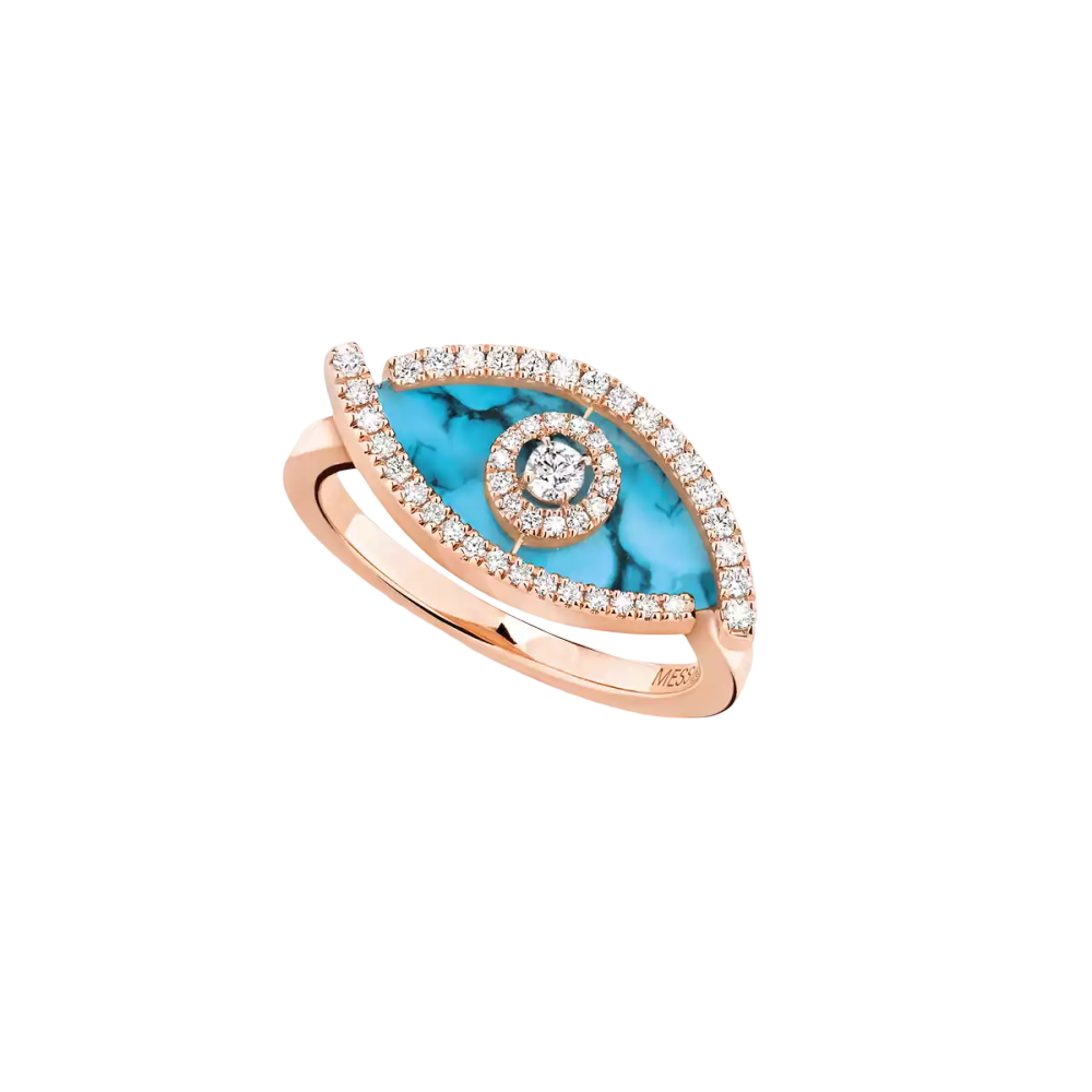 Valérie Messika has designed two new colourful rings to complete the Lucky Eye jewelry collection with the iconic stylised lucky eye. This version in turquoise and pink gold is an invitation to travel. Synonymous with freedom, turquoise enhances the Lucky Eye diamond ring. Its diamond pupil and pavé border combine with a delicate diamond setting for a dazzling effect!