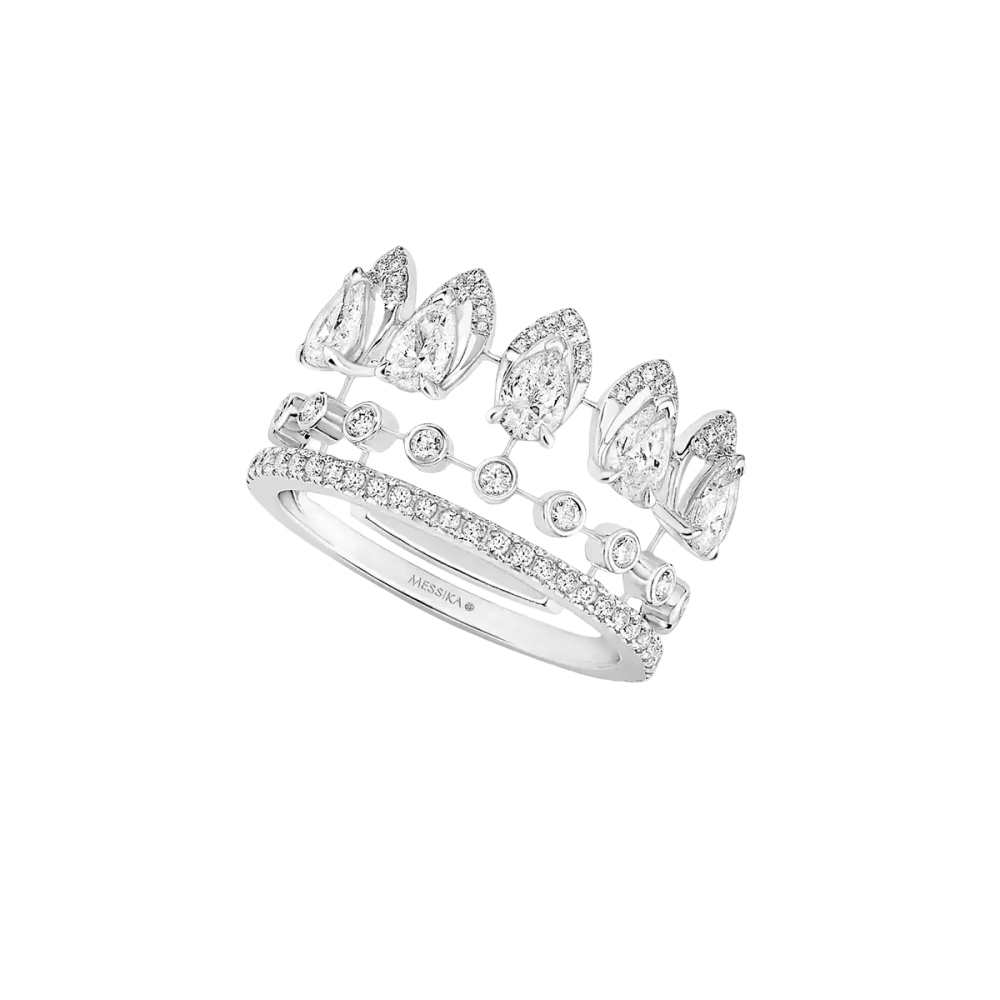 Discover this stunning white gold diamond wedding ring Desert Bloom! The perfect match between design and know-how. Make no mistake, this Desert Bloom 18 carat white gold diamond wedding ring will dazzle your senses and set your heart racing. Three bands of diamonds adorn the finger like a little crown, all three seemingly independent from each other. Featuring the signature design of the Desert Bloom diamond jewelry collection, five pear-cut diamonds are accentuated by the feather setting, a unique technique developed by the Maison in Messika’s High Jewelry atelier.