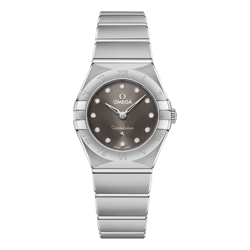 The dramatic and enduring design of the OMEGA Constellation is characterised by its famous half-moons, “claws” on the case and mono-rang bracelet.This 25 mm stainless steel model features a bezel engraved with Roman numerals, sun-brushed grey dial with diamond hour markers and scratch-resistant saphire crystal. The hands, OMEGA logo, Constellation star and diamond holders are in 18K white gold.At the heart of this timepiece is the OMEGA Calibre 4061, while the caseback is stamped with the Constellation Observatory medallion.