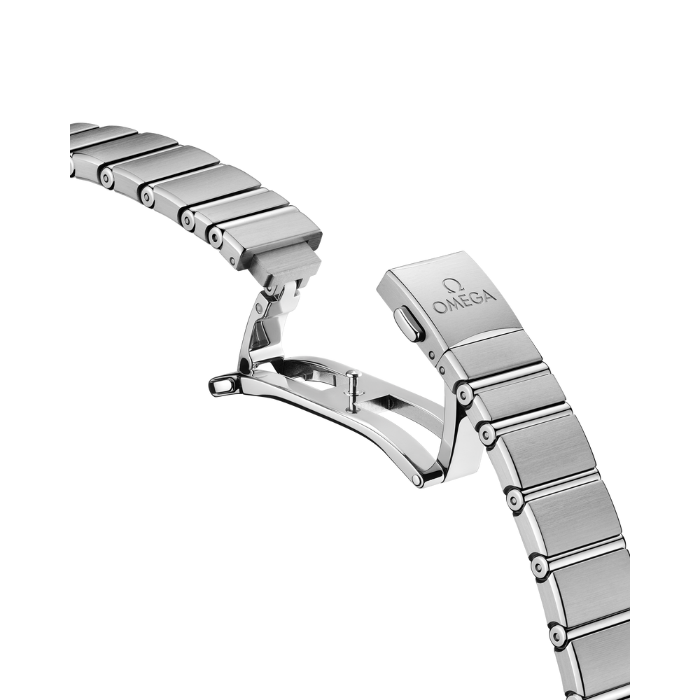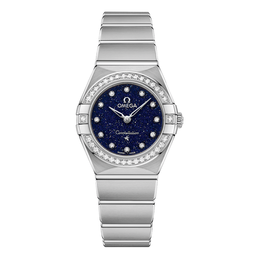 The dramatic and enduring design of the OMEGA Constellation is characterised by its famous half-moons, “claws” on the case and mono-rang bracelet.This 25 mm stainless steel model features a diamond-paved bezel and a blue aventurine glass dial with diamond hour markers. The hands, OMEGA logo, Constellation star and diamond holders are in 18K white gold.At the heart of this timepiece is the OMEGA Calibre 4061, while the caseback is stamped with the Constellation Observatory medallion.