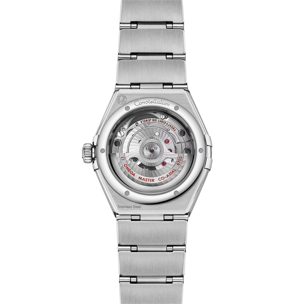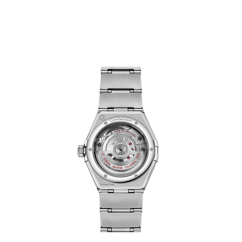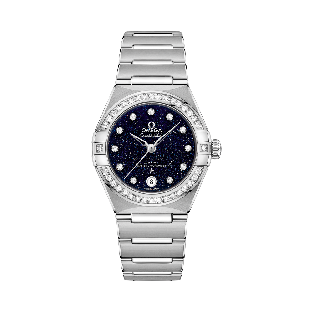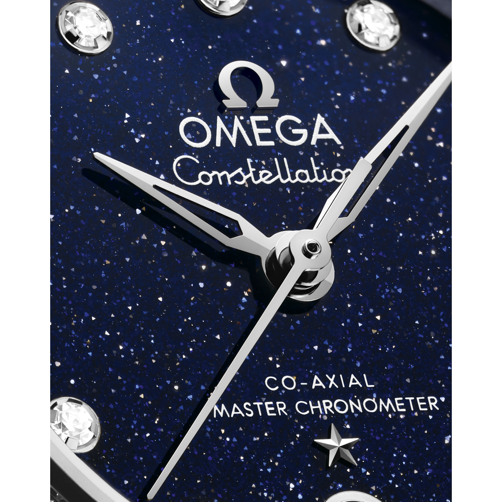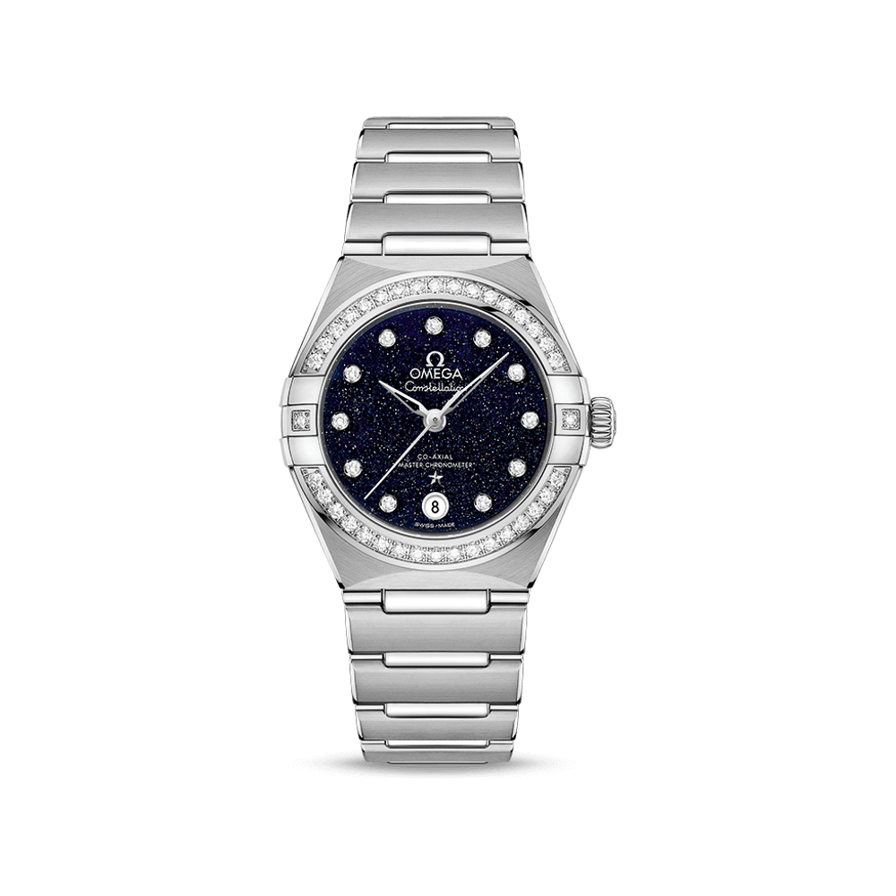 The dramatic and enduring design of the OMEGA Constellation is characterised by its famous half-moons, “claws” on the case and mono-rang bracelet.This 29 mm stainless steel model features a diamond-paved bezel, blue aventurine glass dial with diamond hour markers and a date window at the 6 o'clock position. The hands, OMEGA logo, Constellation star and diamond holders are in 18K white gold.At the heart of this timepiece is the OMEGA Co-Axial Master Chronometer Calibre 8700, visible through the domed scratch-resistant sapphire crystal.