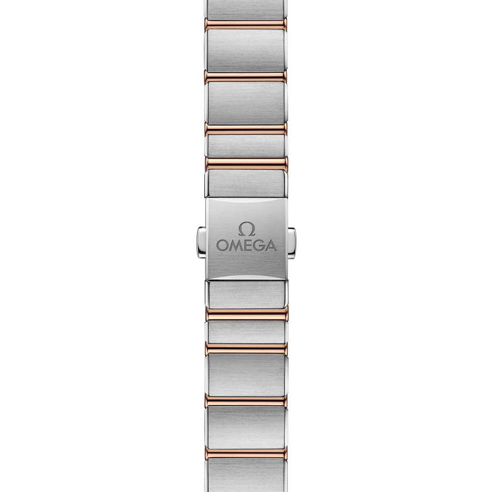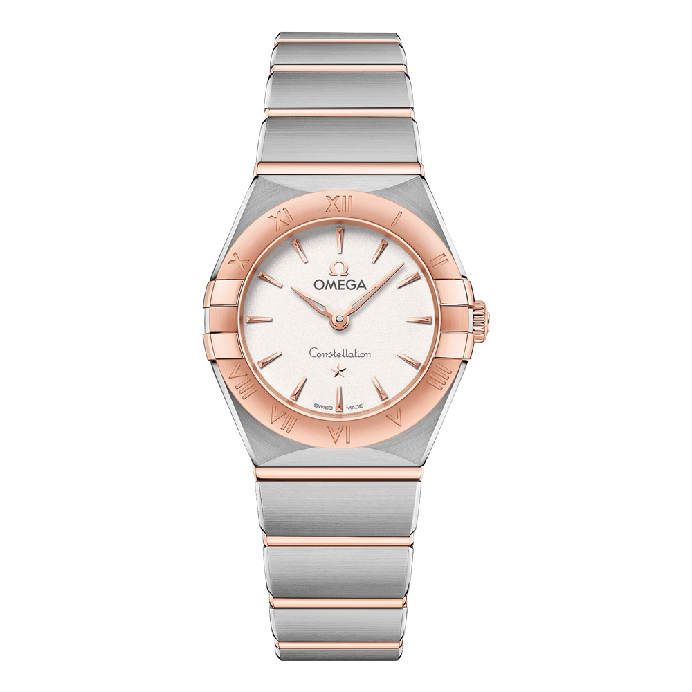 This 25 mm 18K Sedna™ gold and stainless steel model features a bezel engraved with Roman numerals, crystal white silvery dial and scratch-resistant saphire crystal. The hands, OMEGA logo, Constellation star and indexes are also in 18K Sedna™ gold.