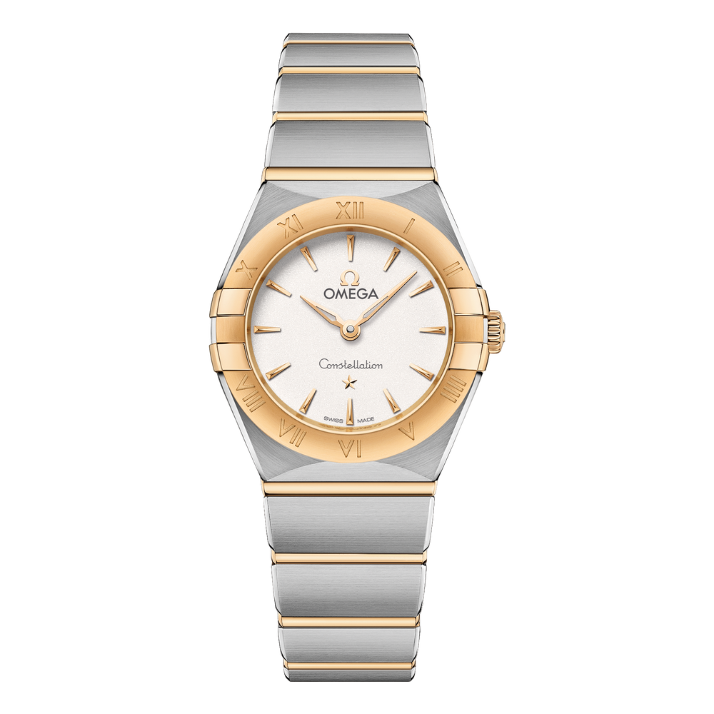 This 25 mm 18K yellow gold and stainless steel model features a bezel engraved with Roman numerals, crystal white silvery dial and scratch-resistant saphire crystal. The hands, OMEGA logo, Constellation star and indexes are also in 18K yellow gold.
