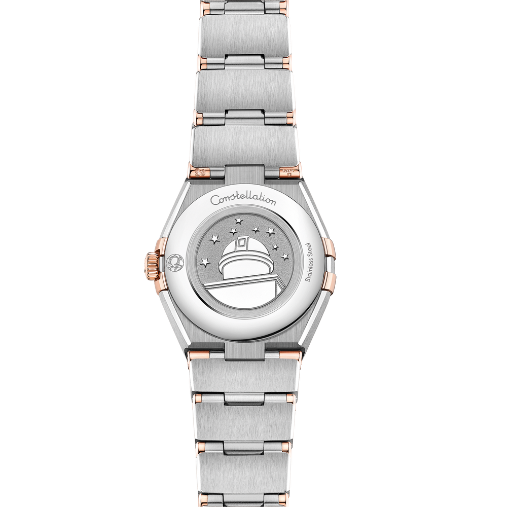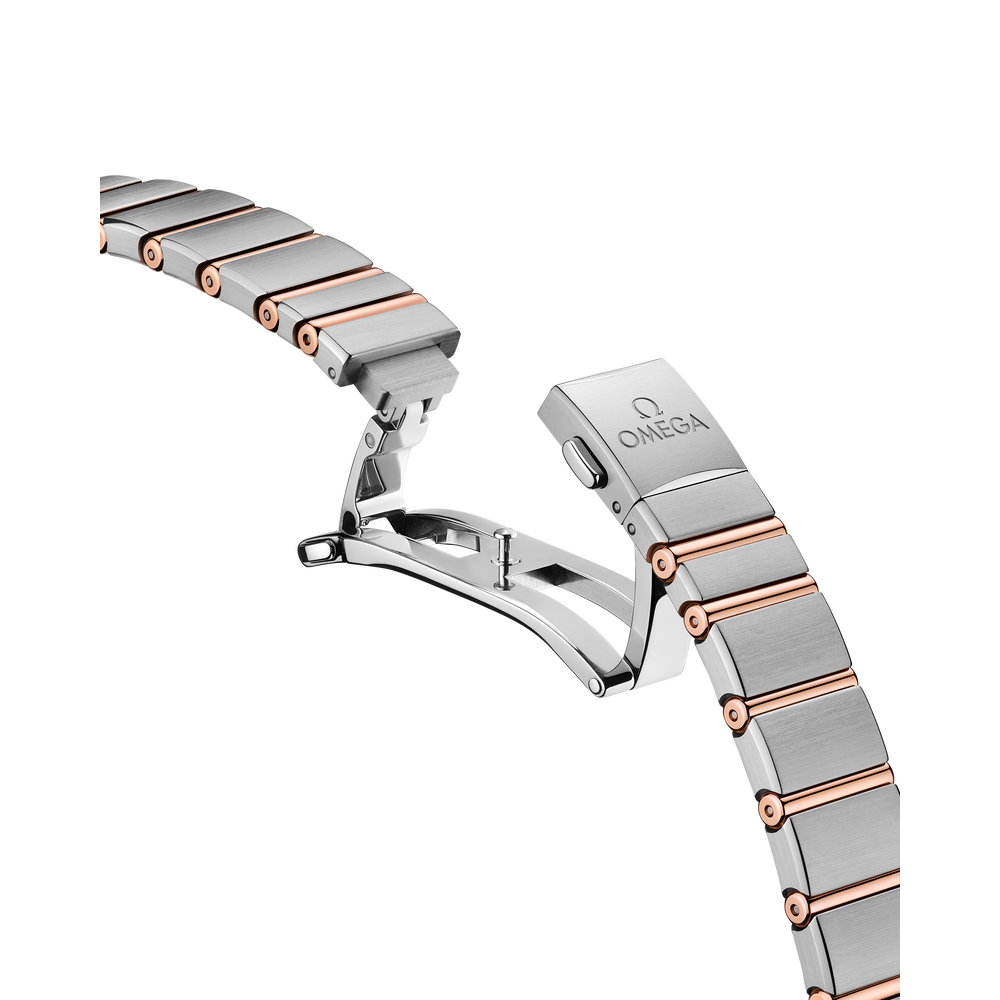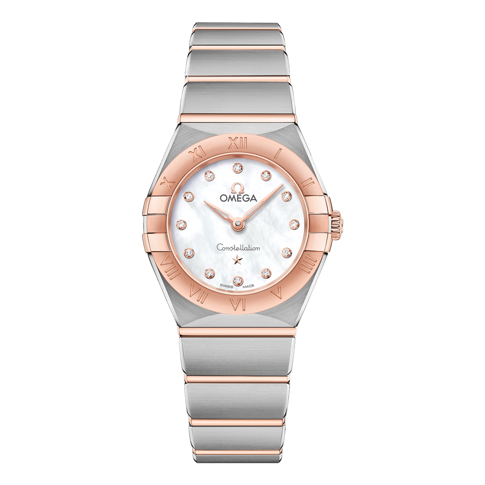 This 25 mm 18K Sedna™ gold and stainless steel model features a bezel engraved with Roman numerals, white mother-of-pearl dial with diamond hour markers and scratch-resistant saphire crystal. The hands, OMEGA logo, Constellation star and diamond holders are also in 18K Sedna™ gold.