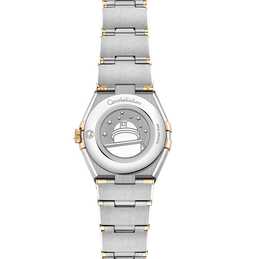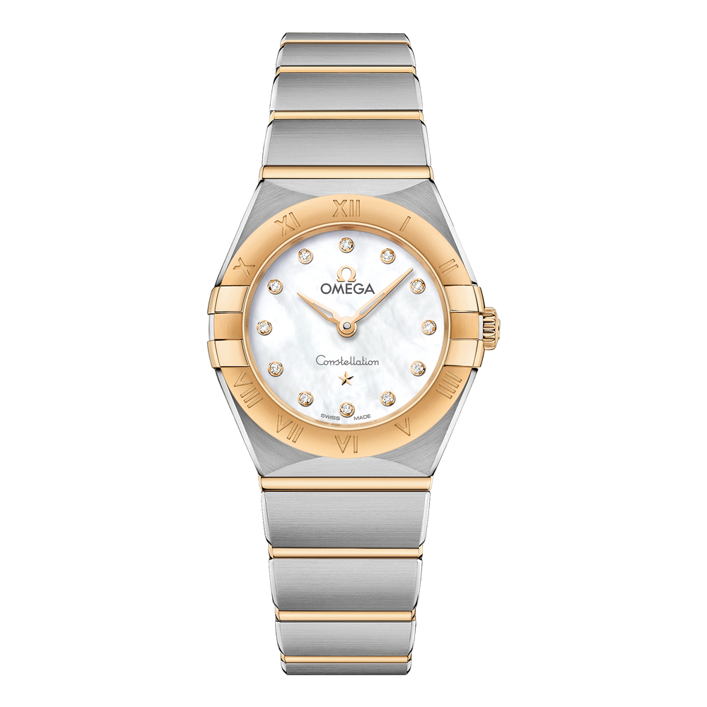 The dramatic and enduring design of the OMEGA Constellation is characterised by its famous half-moons, “claws” on the case and mono-rang bracelet.This 25 mm 18K yellow gold and stainless steel model features a bezel engraved with Roman numerals, white mother-of-pearl dial with diamond hour markers and scratch-resistant saphire crystal. The hands, OMEGA logo, Constellation star and diamond holders are also in 18K yellow gold.At the heart of this timepiece is the OMEGA Calibre 4061, while the caseback is stamped with the Constellation Observatory medallion.