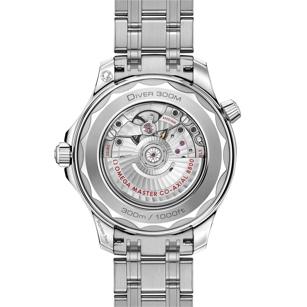 The watch is presented on an adjustable stainless steel bracelet with extra diver extension, and is driven by the OMEGA Master Chronometer Calibre 8800, which can be seen through the sapphire-crystal on the wave-edged caseback.