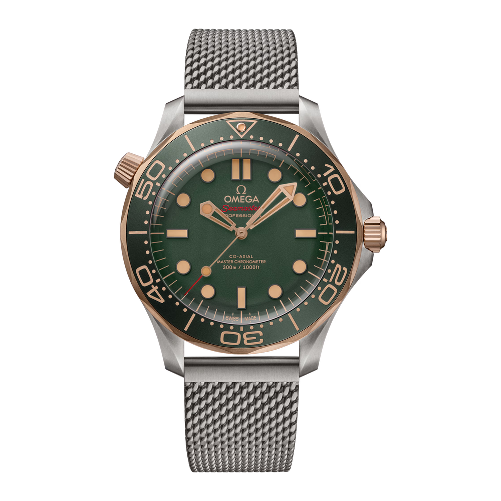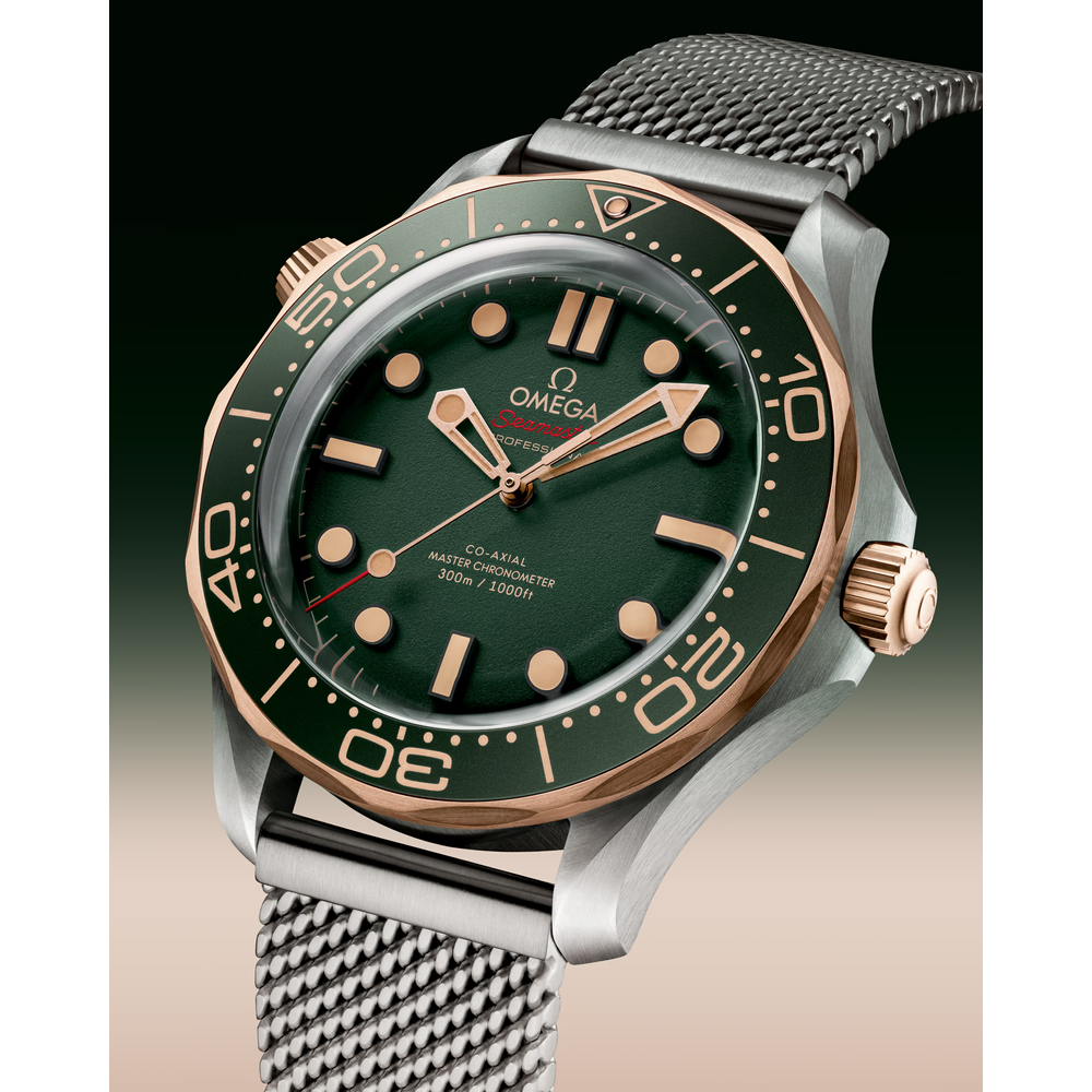 This 42 mm model is crafted in grade 2 titanium and OMEGA’s exclusive 9K Bronze Gold. It includes a green oxalic anodized aluminium bezel ring with a diving scale in vintage Super-LumiNova.