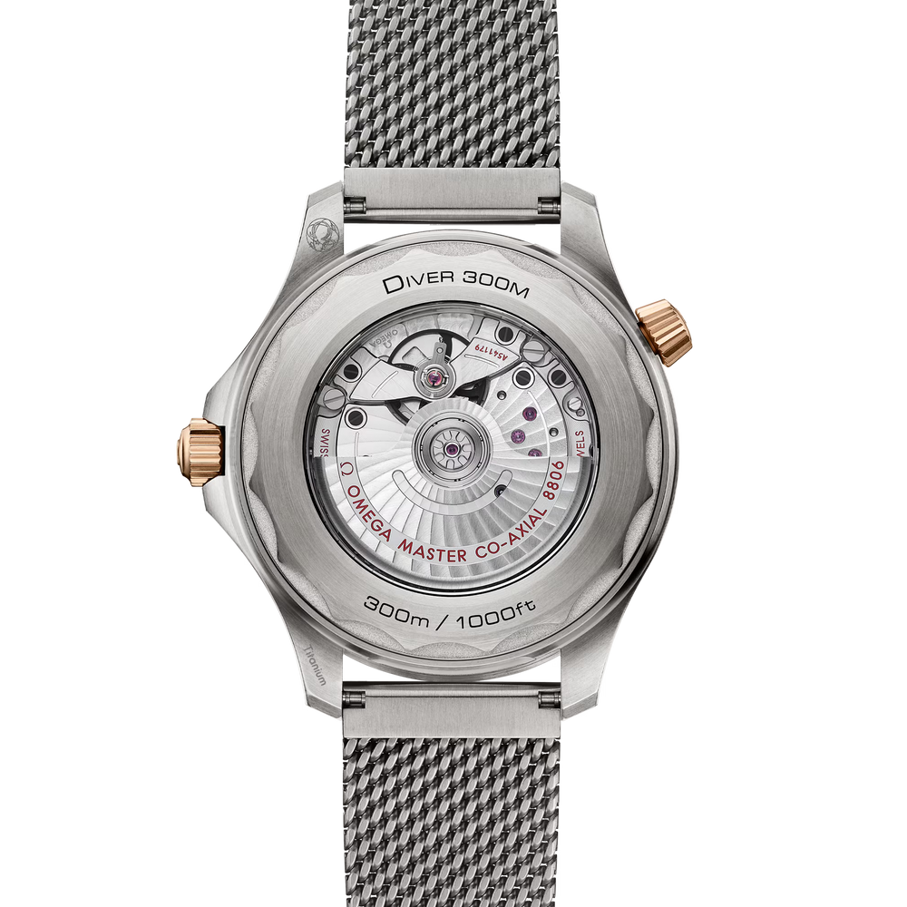 The watch is presented on a brushed mesh bracelet with clasp, and is driven by the OMEGA Co-Axial Master Chronometer Calibre 8806, which can be seen through the sapphire-crystal and wave-edged caseback.