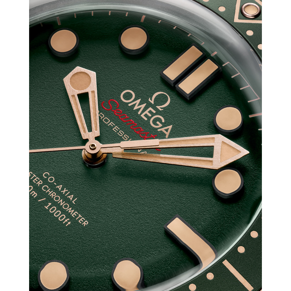 Sandblasted green aluminium is used to create the dial, which features PVD 18K Bronze Gold hands and blackened indexes, all filled with vintage Super-LumiNova. The other markings, including the OMEGA logo, are transferred in light brown and red.