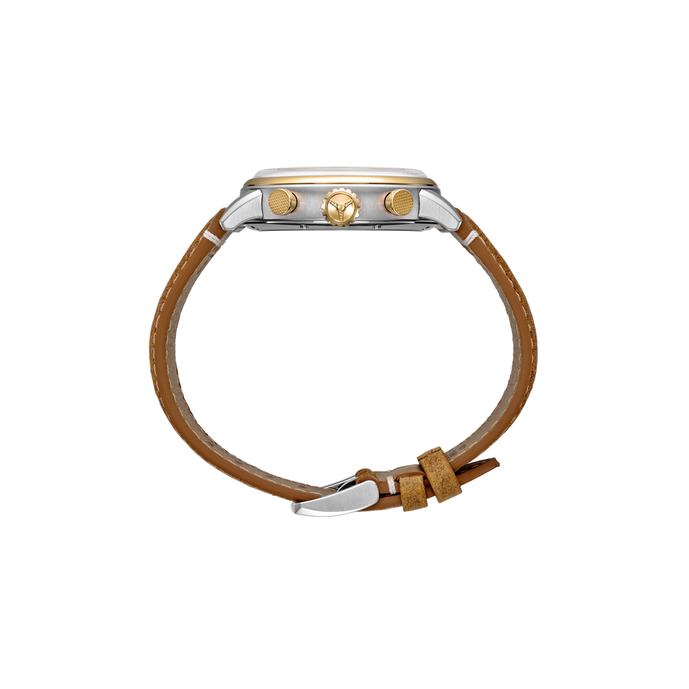 Strap: Brown perforated calfskin leather strap with matching stitching