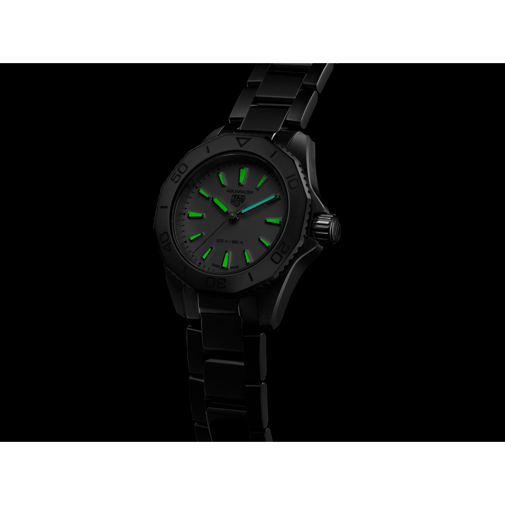 The TAG Heuer Aquaracer is built for everyday use. A true tool watch with versatile style, ready to help you overcome your personal limits. This 30mm model stands out with a shimmering silver dial and unmistakable boldness.