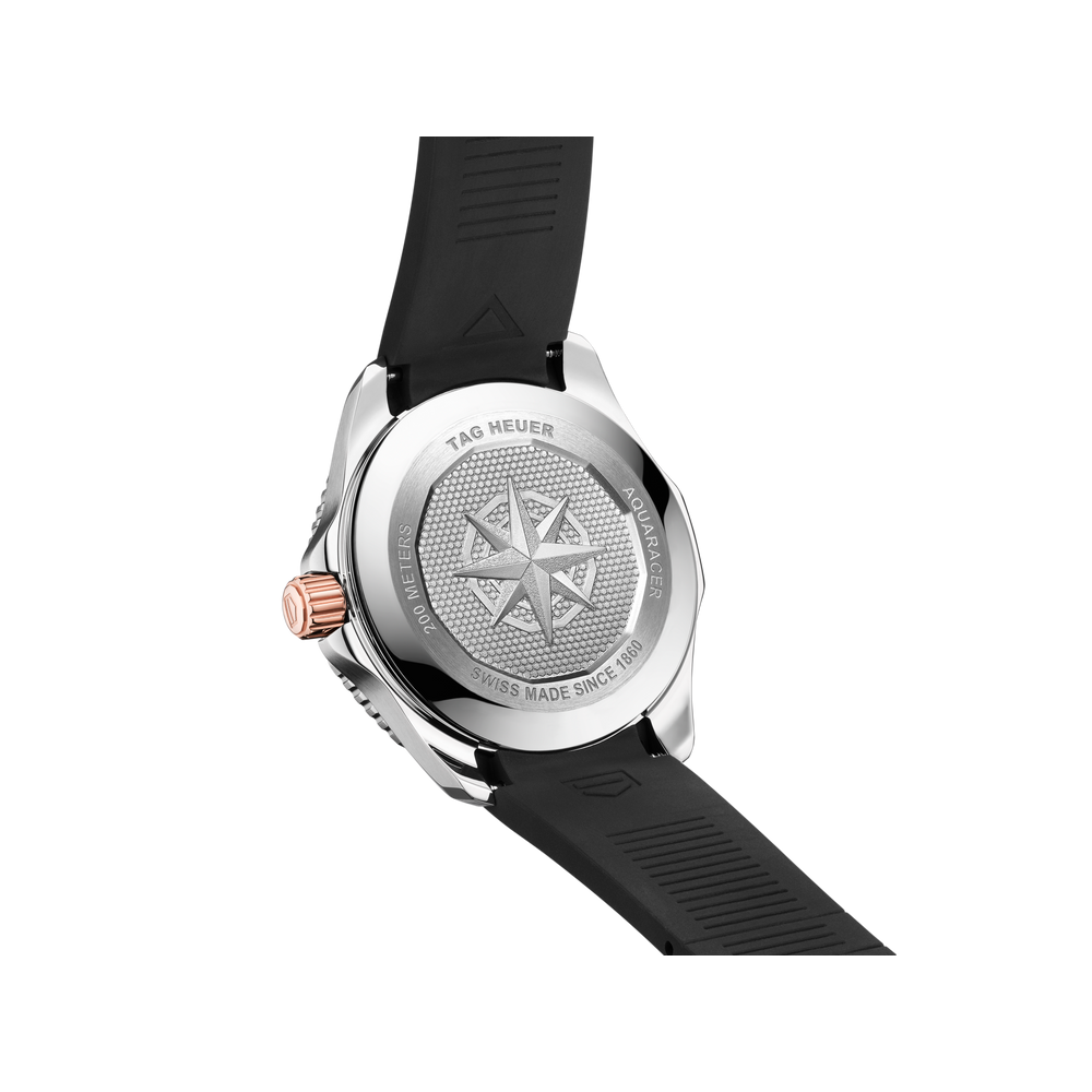 Luxury meets ultra-resistance in this showy TAG Heuer Aquaracer. The 18K 5N rose-gold bezel inlay and screw-down crown stand out next to the smoky-black dial adorned with highly legible hands and markers. A watch geared for every achievement.