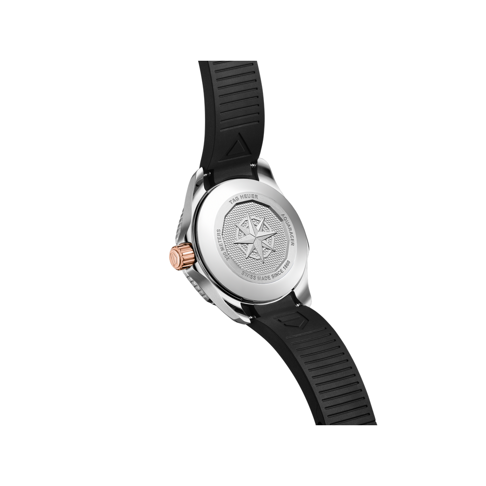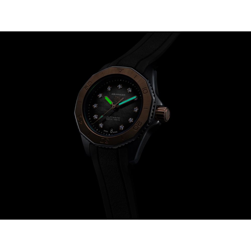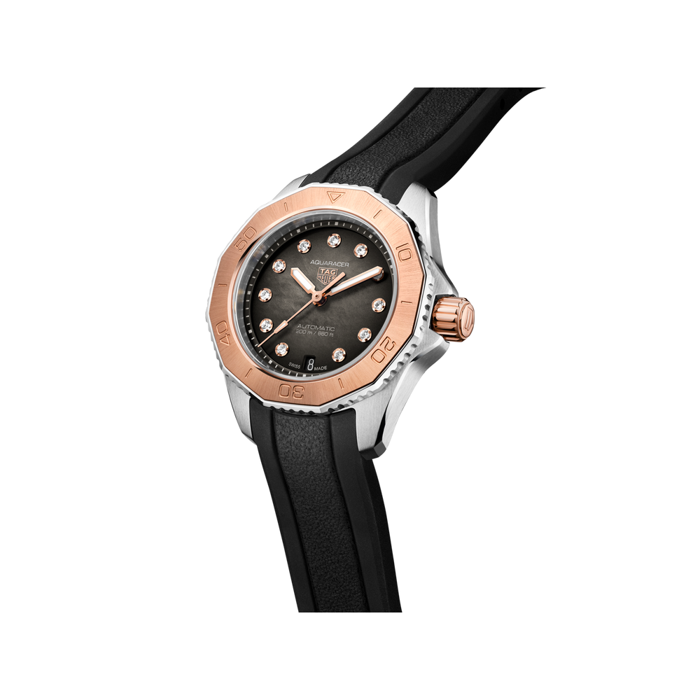 Elegance shines through every detail of this superior TAG Heuer Aquaracer, where 18K 5N solid rose gold and shimmering VS 1.4mm-diametre diamonds (0.107 ct) have pride of place. With its smoky-black dial and matching resilient rubber strap, it is set to go further than ever.