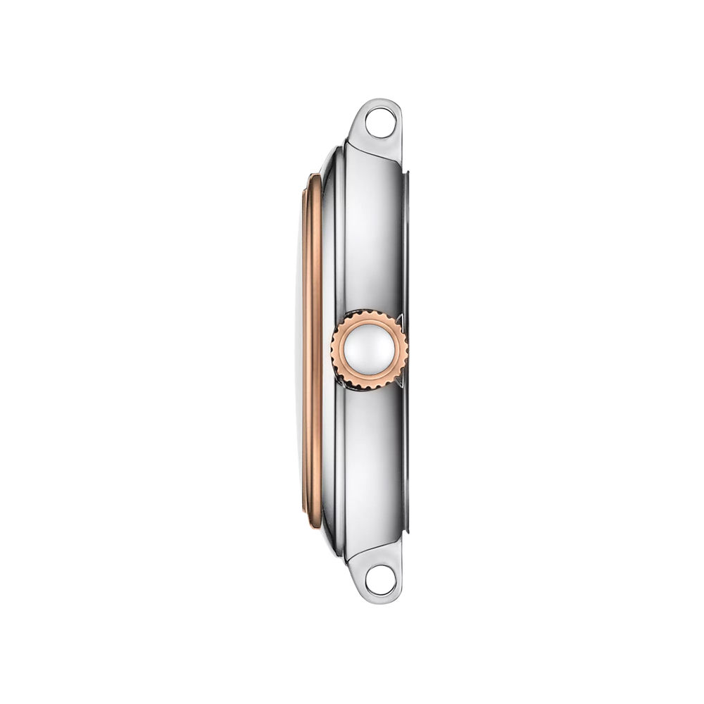 Classic designs don’t come more timeless than the Bellissima Small Lady. The round case and five link bracelet are made of steel, with highlights in warm rose gold PVD that give the watch its luxurious feel and day to night versatility. The watch has a silver Roman numeral dial with a beautiful rose shaped guilloché pattern, while a final flourish is the dazzling white ceramic cabochon set into the crown. With these elegant details, the Bellissima Small Lady will remind her you love her every day.