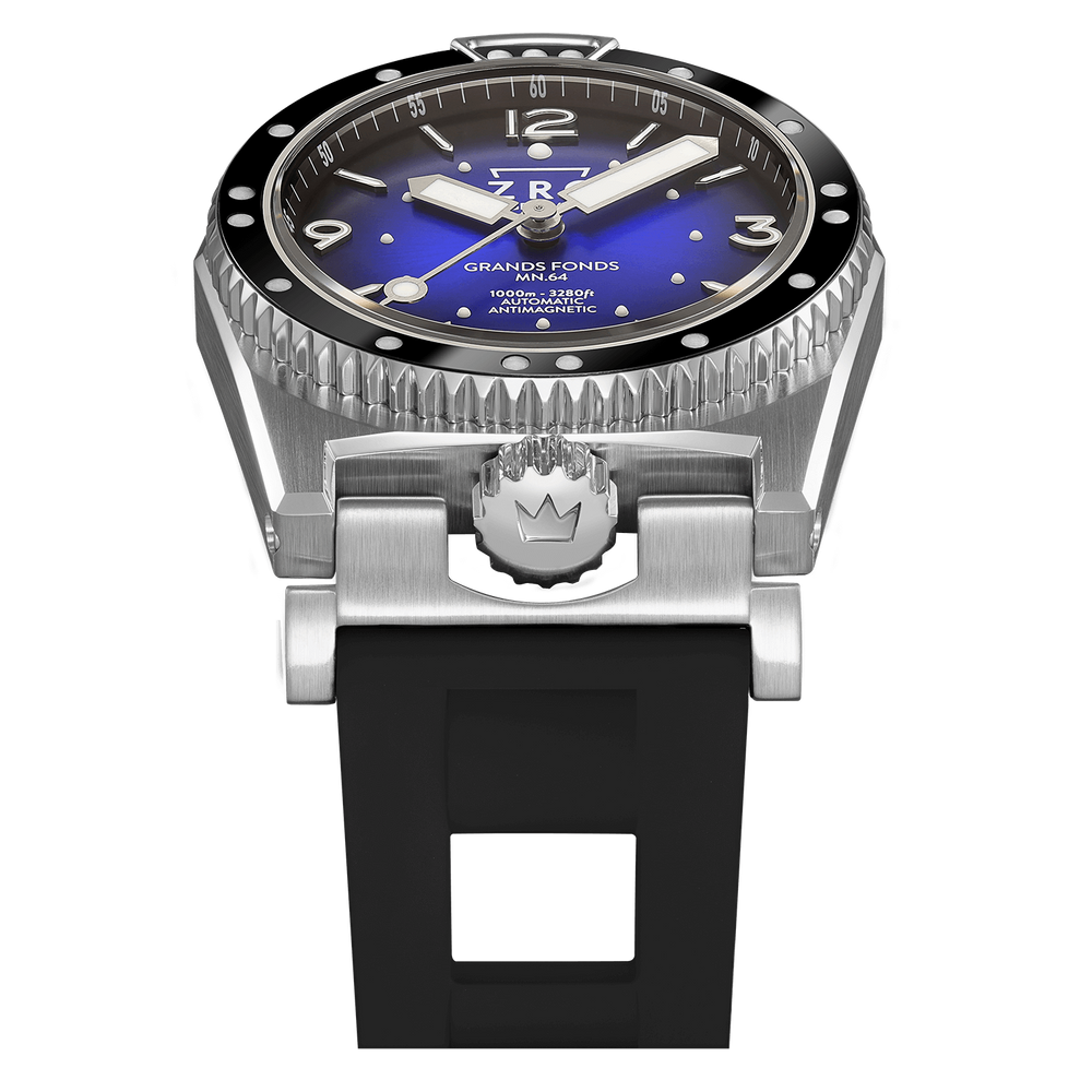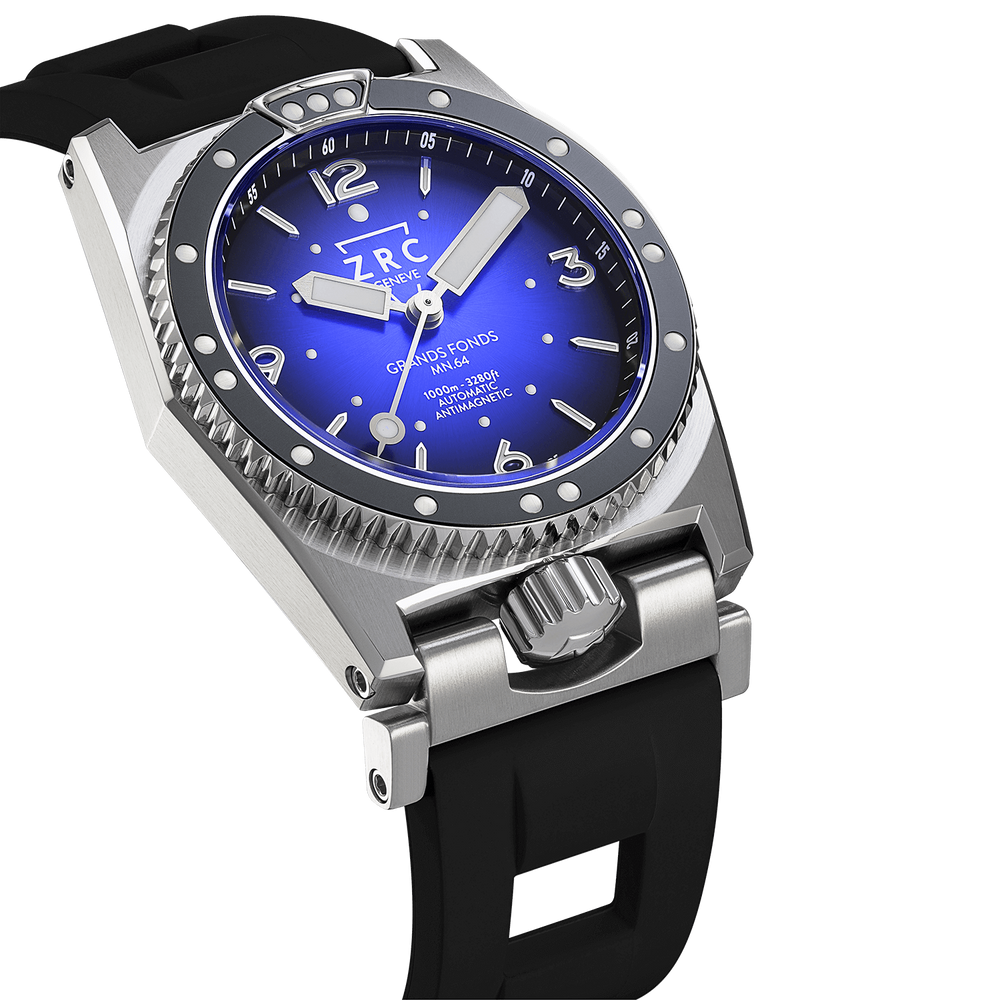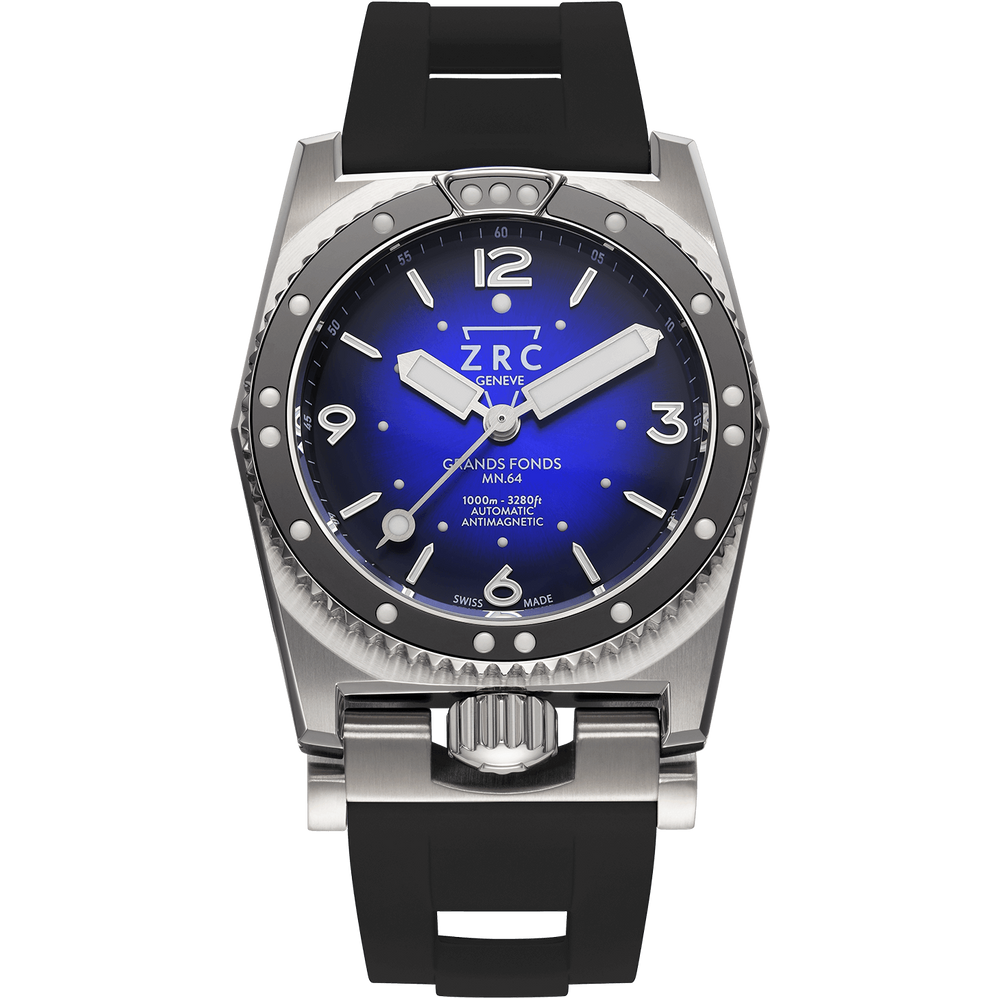 With its navy blue/black gradient dial, satin-finished steel case and metal bracelet, this version represents the quintessence of the Grands Fonds 300