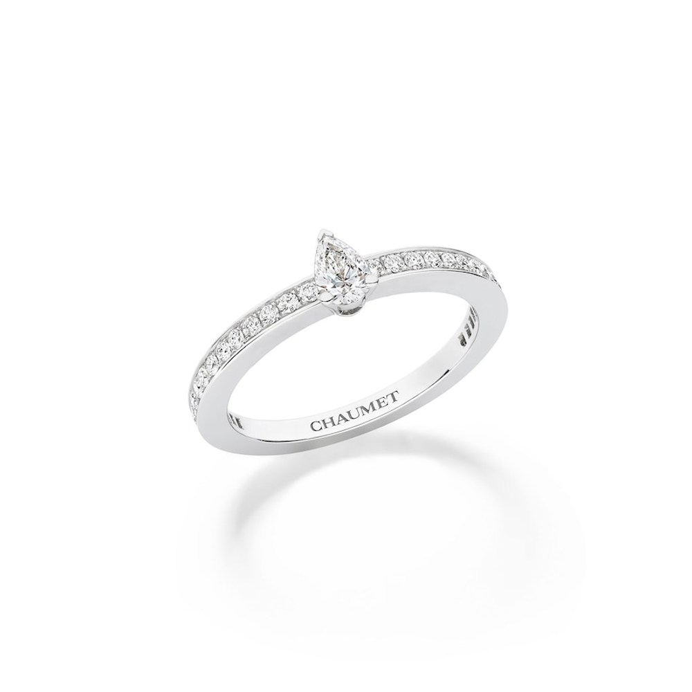 Bague Triomphe de Chaumet en platine, serti d'un diamant poire et de diamants taille brillant.