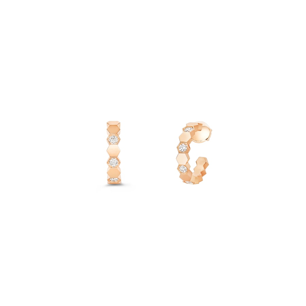Façonnées selon une géométrie parfaite, les créoles Bee de Chaumet illuminent le lobe de ses alvéoles en diamants et or rose, pour un style à la fois précieux et solaire. Les créoles Bee de Chaumet se présentent comme un incontournable de la joaillerie, elles vous feront aussi bien briller au quotidien que lors d’une occasion particulière. Ces boucles d’oreilles se marient admirablement avec les autres créations lumineuses de la collection. Les créoles Bee de Chaumet ont été développées pour s’ajuster avec précision à la forme du visage. Un des anneaux se porte spécifiquement à l'oreille droite et l'autre à l’oreille gauche, afin d’être parfaitement placé sur le lobe.