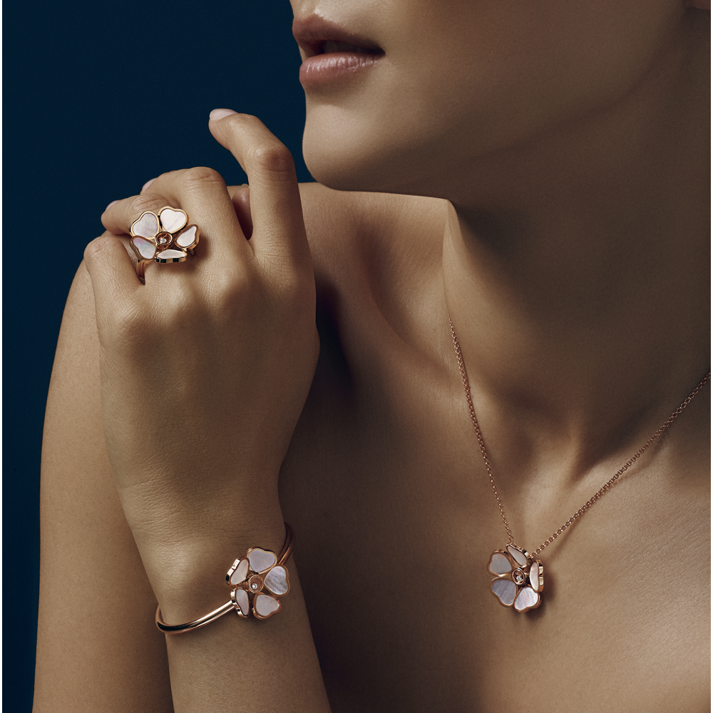 Happy Hearts Flowers joue sur les symboles de la Maison en disposant autour d'un diamant mobile une corolle de cinq cœurs, formant ainsi des fleurs délicates et extrêmement féminines. Little Diamonds Do Great Things