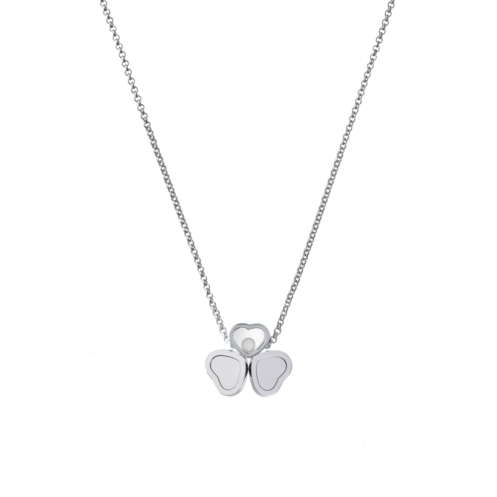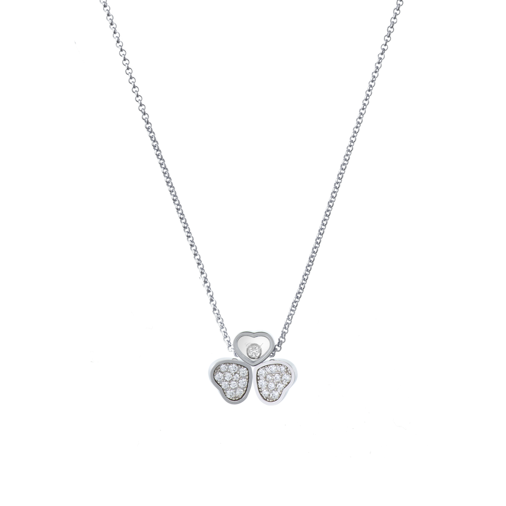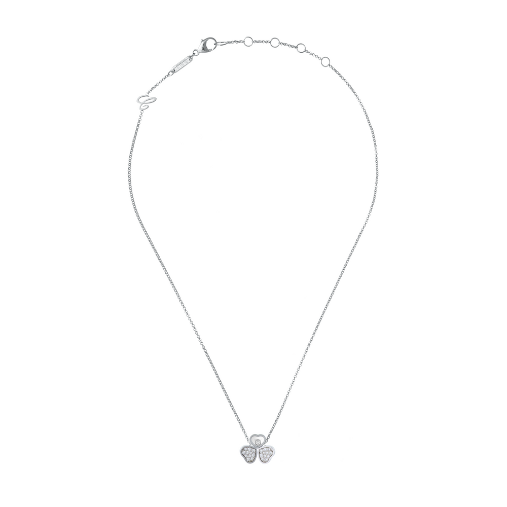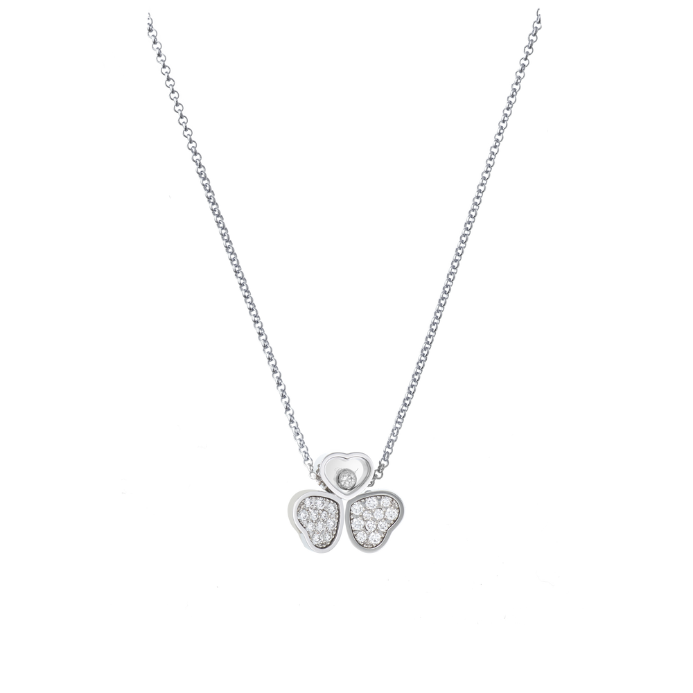 Le papillon, emblème par excellence de légèreté, a soufflé aux colliers en diamant Happy Hearts Wings toute sa délicatesse et sa force symbolique. Il trouve dans les lignes de cette collection de bijoux de luxe un aboutissement d’un grand raffinement, en résonance avec les symboles de la Maison Chopard. Deux cœurs en or blanc et diamants, disposés comme des ailes de papillon, sont suspendus à un cœur dans lequel se love un diamant mobile. Little Diamonds Do Great Things