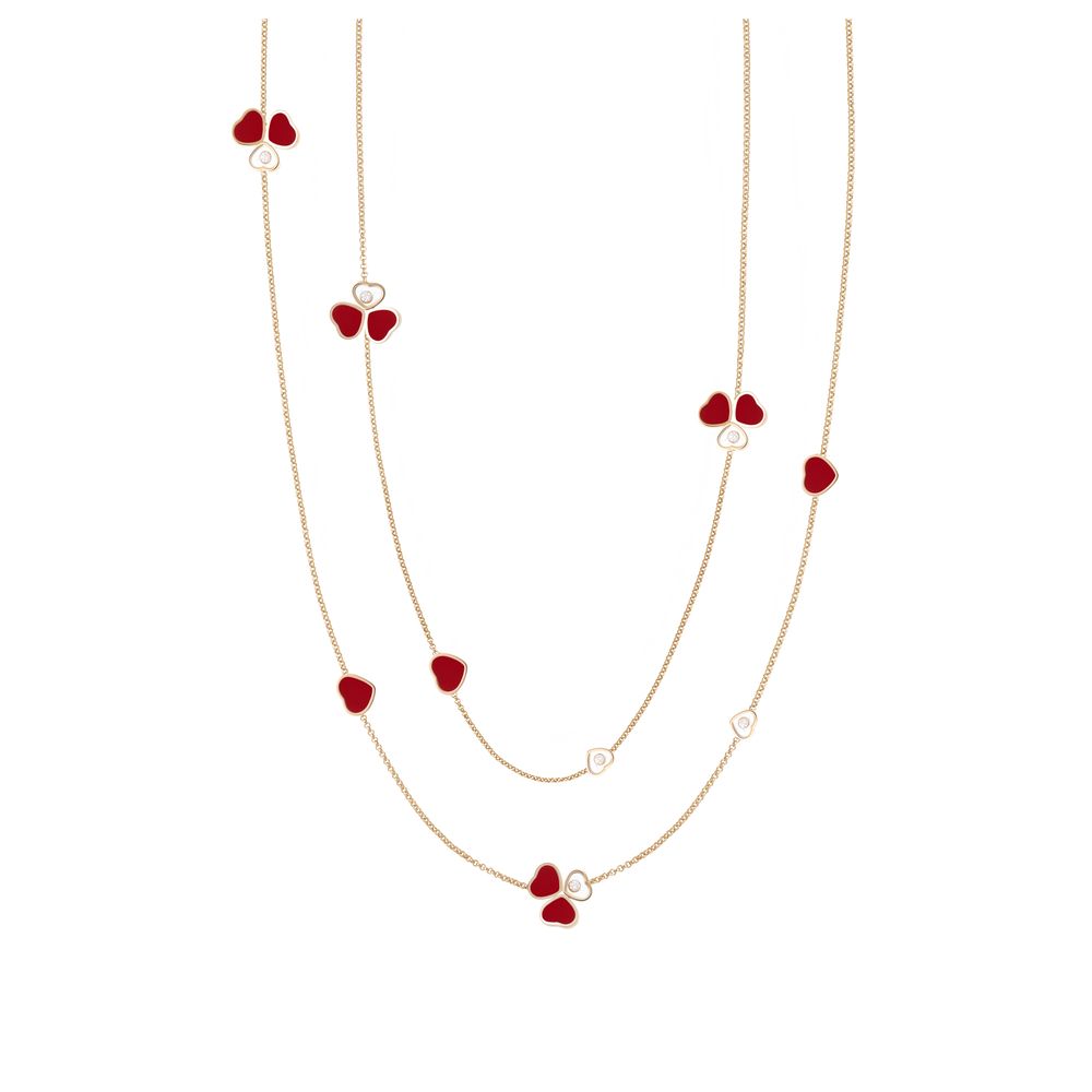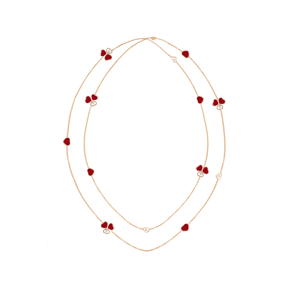 Le papillon, emblème par excellence de légèreté, a soufflé aux sautoirs diamant Happy Hearts Wings toute sa délicatesse et sa force symbolique. Il trouve dans les lignes de cette collection de bijoux de luxe un aboutissement d’un grand raffinement, en résonance avec les symboles de la Maison Chopard. Deux cœurs en pierre rouge et or rose, disposés comme des ailes de papillon, sont suspendus à un cœur dans lequel se love un diamant mobile. Little Diamonds Do Great Things