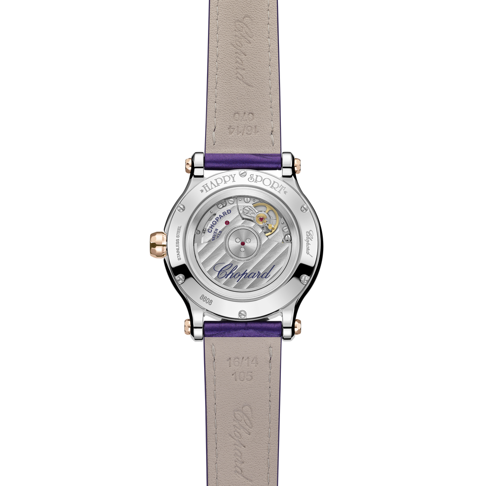 La collection de montres à diamants mobiles pour femme Happy Sport est l’emblème même de la créativité et de l’audace de Chopard. Les pierres précieuses enjouées de cette montre en or rose et Lucent Steel™, dansant entre deux glaces saphirs, font rêver depuis 1993, date à laquelle Chopard est devenue la première Maison à associer Lucent Steel™ et diamants. Grâce à son expertise horlogère, Chopard a doté la montre Happy Sport 33 mm d’un mouvement mécanique à remontage automatique développé spécialement pour les boîtes féminines. Little Diamonds Do Great Things.