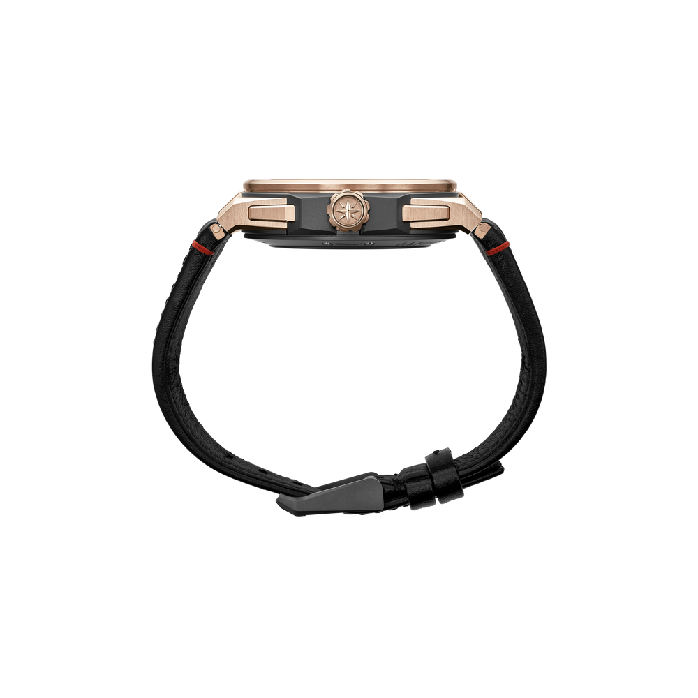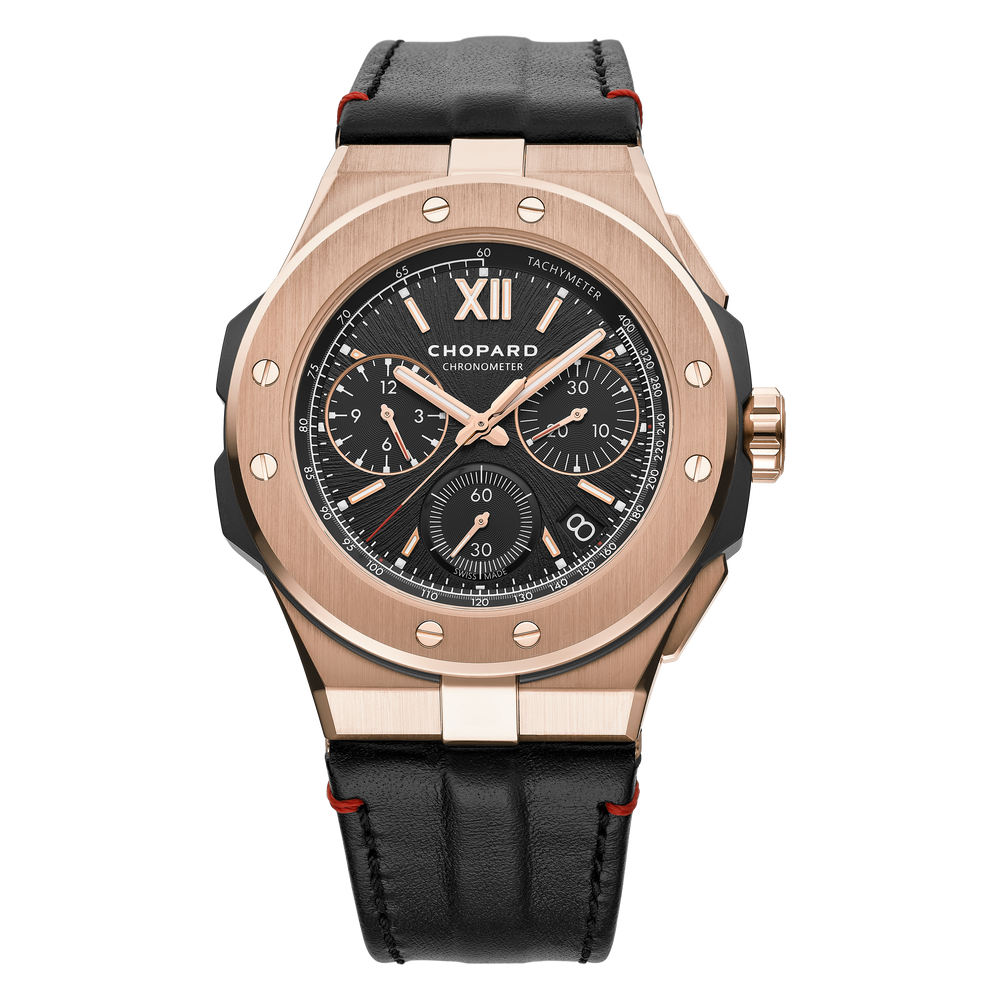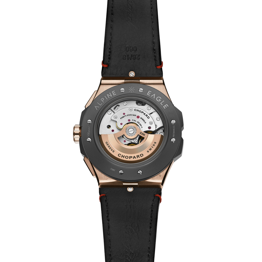 Élégante et sportive, le nouveau garde-temps Alpine Eagle XL Chrono est une interprétation moderne du modèle St. Moritz lancé en 1980, la première montre conçue par Karl-Friedrich Scheufele, aujourd'hui co-président de Chopard. Exprimant la passion de son créateur pour les Alpes et s'inspirant de la noblesse de l'aigle, ce garde-temps est réalisé en or rose éthique 18 carats et en titane céramisé, et dispose d'un mouvement chronographe intégré certifié chronomètre avec fonction flyback. Alpine Eagle rend hommage aux aigles d'aujourd'hui - ces personnes ambitieuses qui se surpassent au quotidien et dont la vision est une source d'inspiration pour leurs pairs. Déterminés et avant-gardistes, ils relèvent avec brio les défis de demain et sont instinctivement conscients de l'importance des questions environnementales.