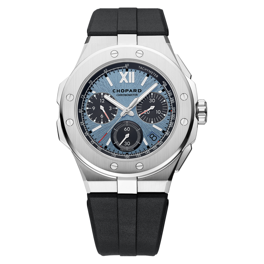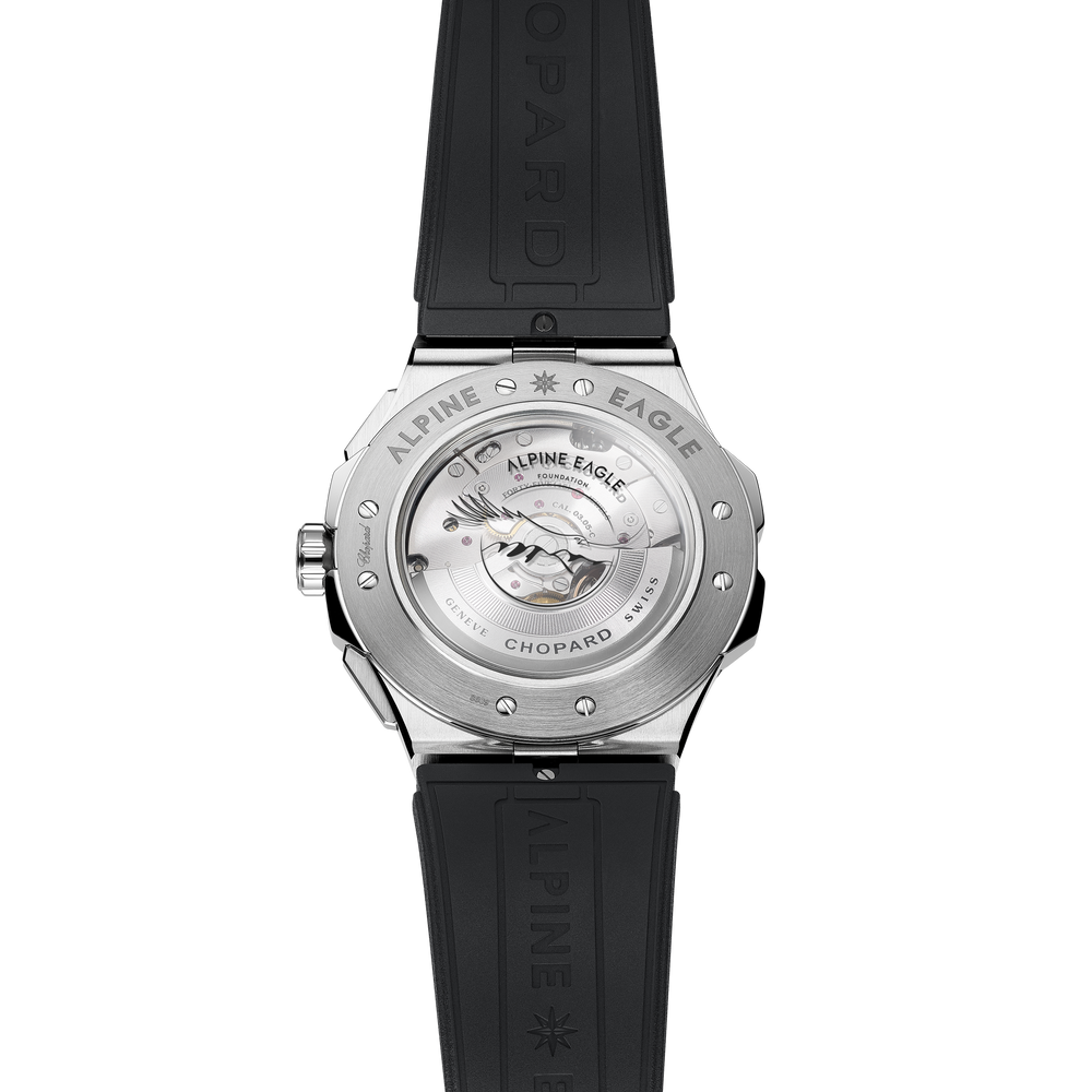 La collection Alpine Eagle décline son chronographe à fonction retour en vol dans un boîtier bénéficiant de l’extrême légèreté du titane grade 5, un métal à la résistance éprouvée. Ce modèle Alpine Eagle XL Chrono, au boîtier de 44 mm de diamètre reste, comme l’entièreté de la collection, très marqué dans son inspiration par la puissance de l’aigle et la beauté des Alpes, et accueille une nouvelle couleur de cadran bleu ''Rhône''. Certifié chronomètre, son mouvement automatique à fonction flyback – le Chopard 03.05-C – fait l’objet de trois brevets qui attestent de sa précision autant que de sa manipulation simplifiée. Dans le prolongement de l’engagement de la Maison pour la préservation de l’environnement alpin et de sa biodiversité, une partie des recettes des ventes de ce modèle sera reversée à la Fondation Alpine Eagle.