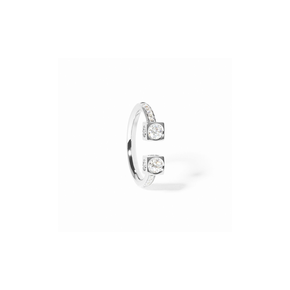 Cette bague pavée joue avec les volumes, les vides et les pleins, les formes rondes et carrées, illustrant parfaitement les codes géométriques chers à la Maison.