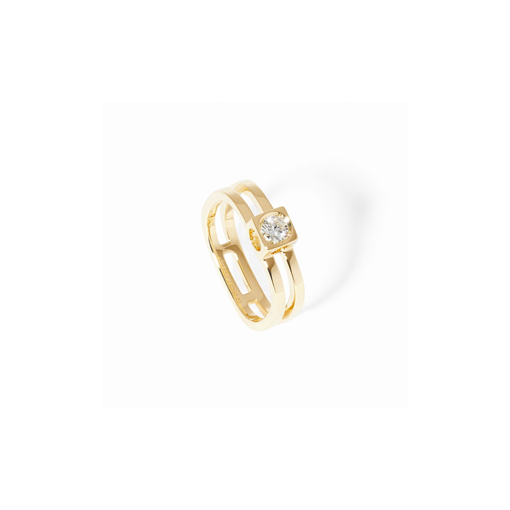 Pour plus de simplicité et se prêtant au jeu de l’accumulation, cette bague 2 rangs se décline dans une version or jaune sublimée par un diamant précieux en son centre. Avec sa forme carrée, ce bijou épouse parfaitement la forme du doigt.