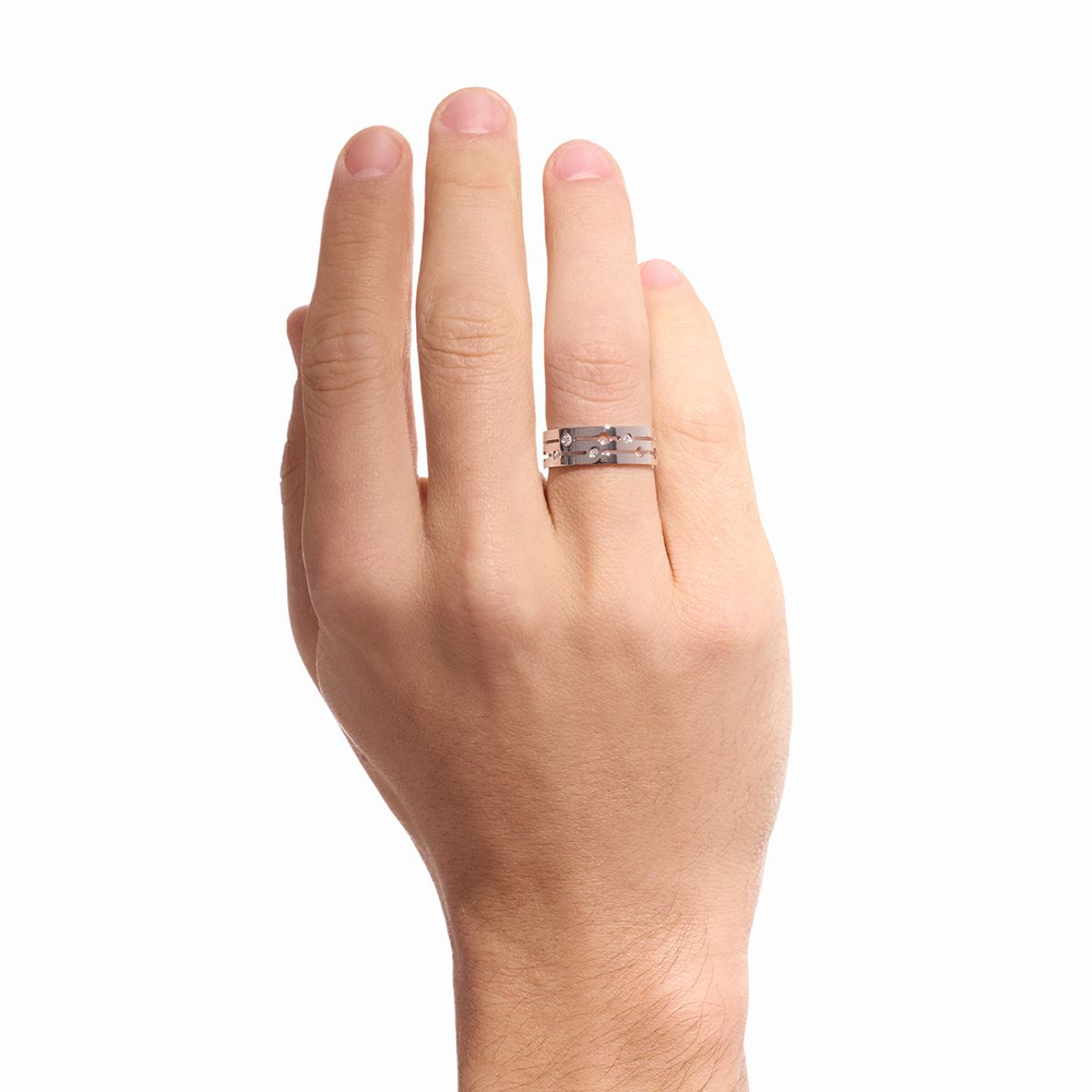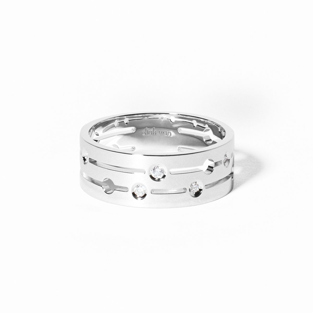 Une bague à la succession de lignes et de vides nous donne le tempo au rythme des diamants sertis cône.