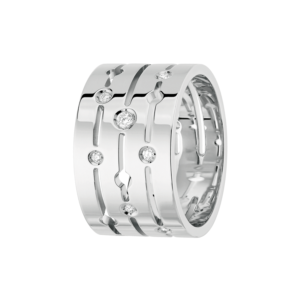 Une bague tubulaire aux formes ajourées sublimée par des diamants apposés de manière discontinue et en cadence.