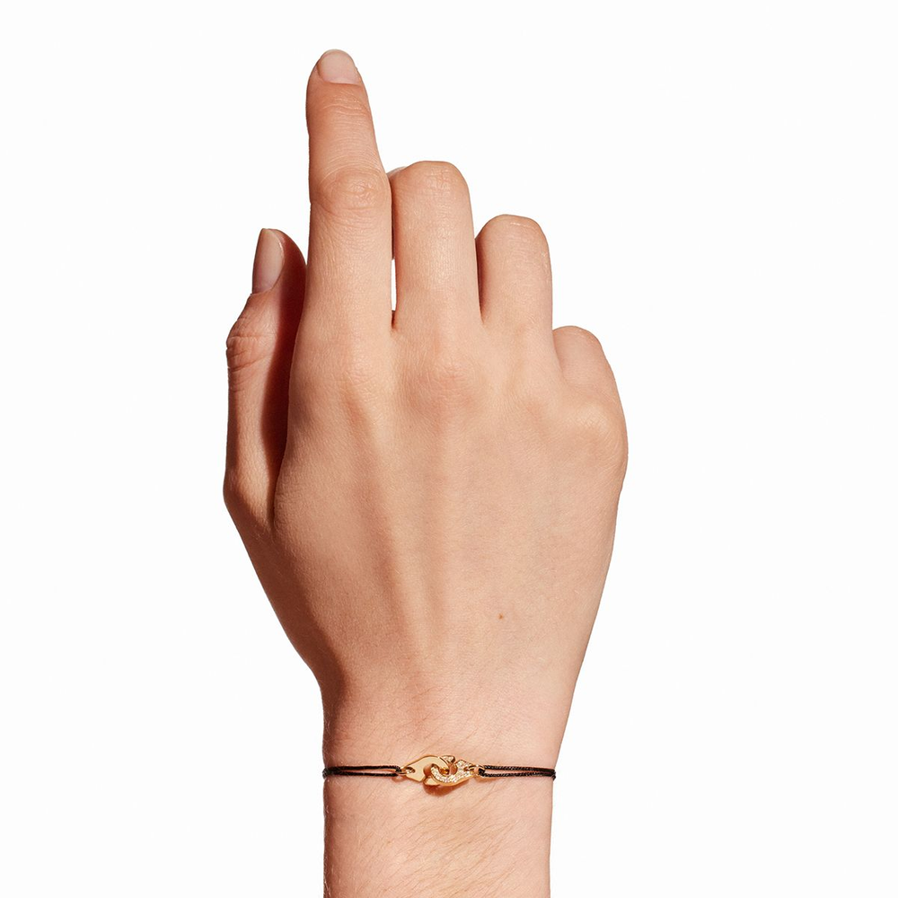 Le motif icône Menottes dinh van se décline en bracelet sur cordon, dans une version or jaune sertie de diamants.
