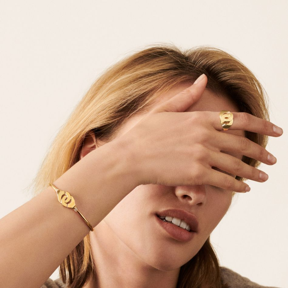 L’iconique fermoir Menottes dinh van se décline sur un bracelet rigide, un motif précieux sublimé de diamants.