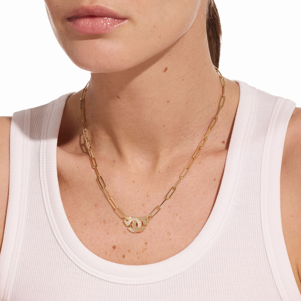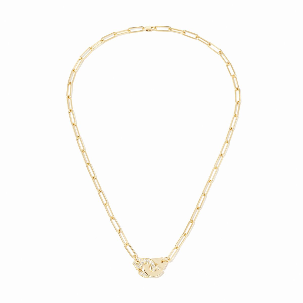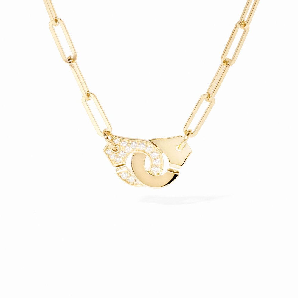 Esprit rebelle, symbole d'union ou d'attachement, le fermoir Menottes dinh van semi-pavé se place au centre de la chaîne signature pour devenir un collier icône.