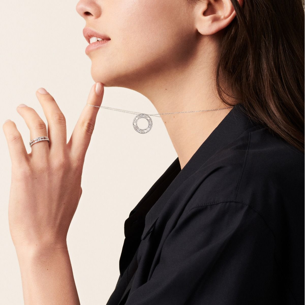 Le pendentif Pulse se réhausse d’un pavage diamant scintillant dans un jeu de lumière qui célèbre tout le savoir-faire joaillier de la Maison.