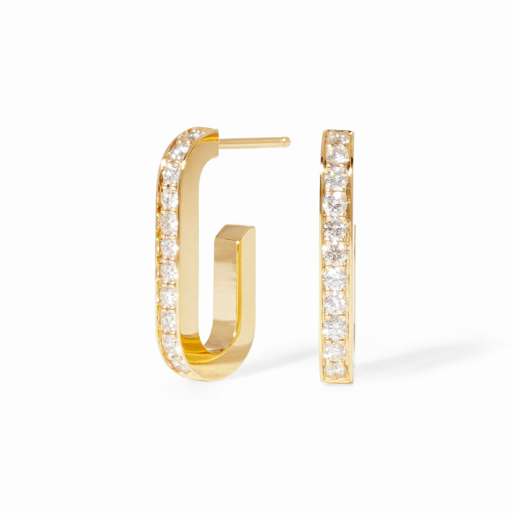 Perfectionniste et animée par les figures géométriques et minimales, la Maison dinh van sculpte le premier maillon à section carrée. Disponibles en or blanc totalement pavées, la paire de boucles d'oreilles "Créoles Maillon moyen modèle" se décline en or jaune et pavage diamant.