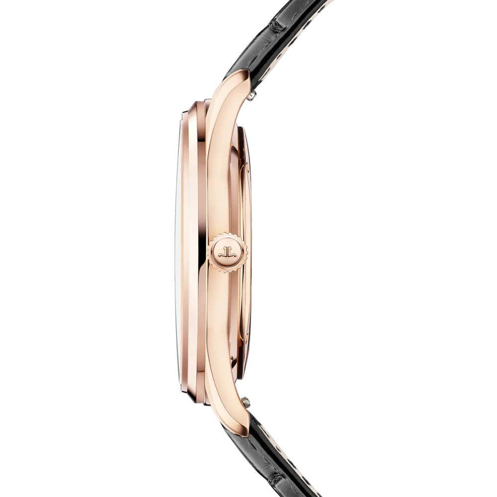 Revisitant l’esthétique épurée de la collection éponyme, la Master Ultra Thin Perpetual Calendar affiche un cadran coquille d’œuf assorti à la boîte en or rose qui forme un élégant contraste avec le bracelet alligator noir et se révèle très confortable au porter. Les aiguilles dorées à la double finition polie satinée et la seconde centrale bleue survolent les trois compteurs indiquant respectivement la date à 3 h, le jour de la semaine à 9 h et le mois à 6 h. Dotée de sa phase de lune à midi et d’un calendrier perpétuel, cette montre à complications raffinée est équipée du Calibre Manufacture 868 offrant 70 h de réserve de marche.