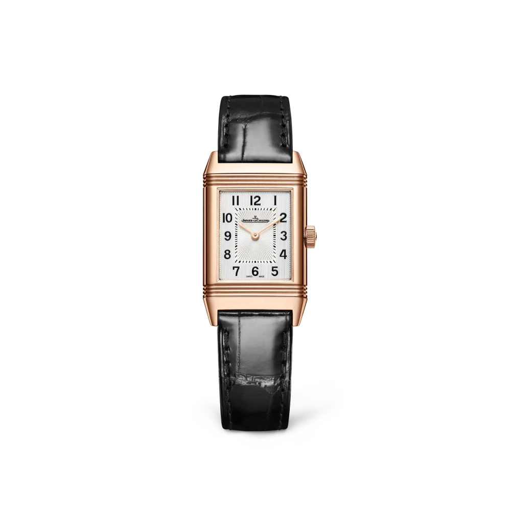 Dans son nouveau boîtier en or rose rehaussé par un bracelet en cuir noir, la montre Reverso Classic Small affiche une allure qui saura séduire les amatrices d’objets vintage. Au cœur de la montre, un mouvement mécanique à remontage manuel, le calibre Jaeger-LeCoultre 846/1. Son cadran au design revisité accueille des aiguilles dorées. Sur une minuterie dite « chemin de fer », se distinguent douze chiffres arabes droits décalqués noirs.