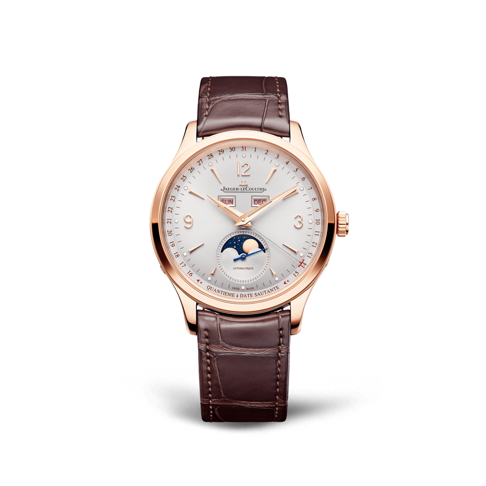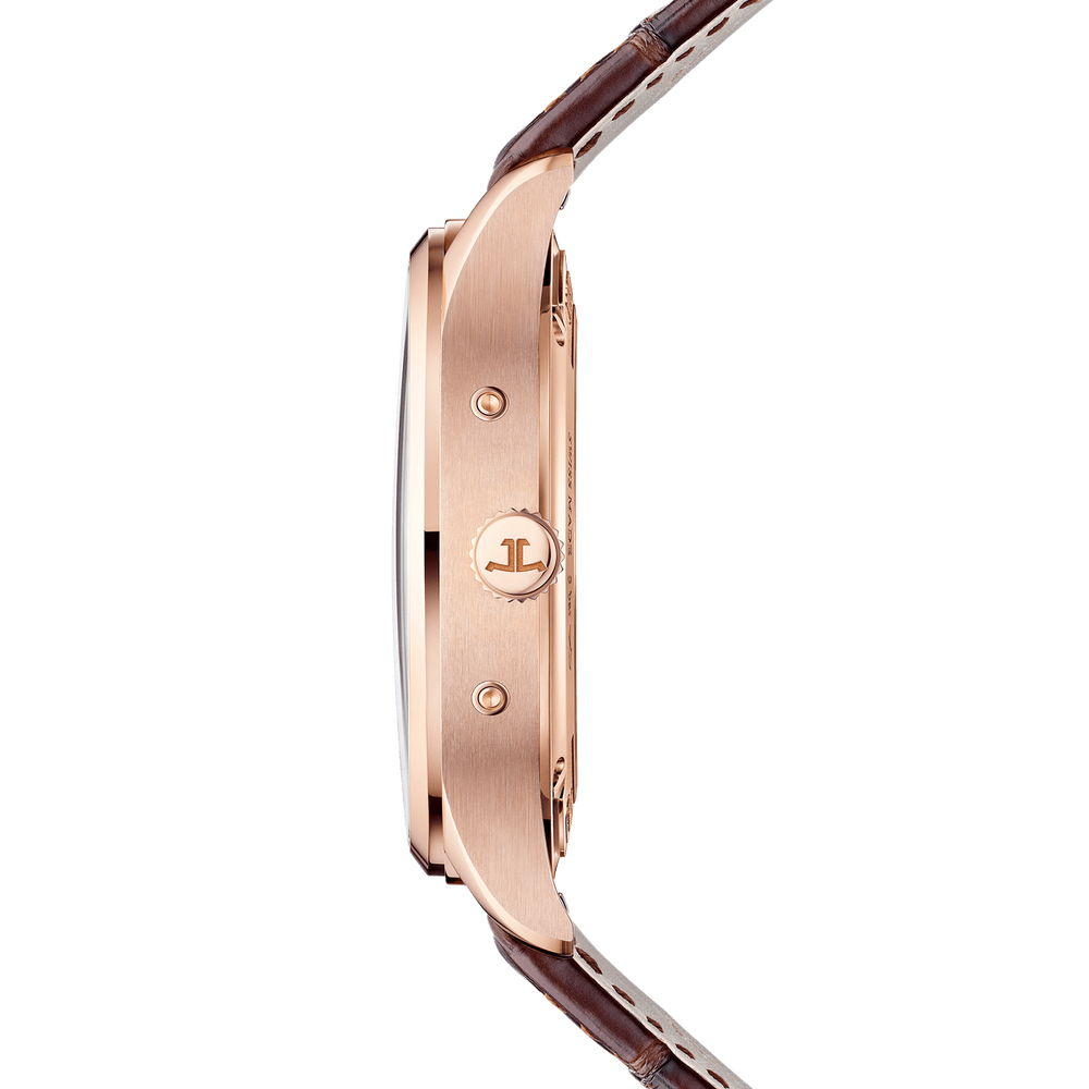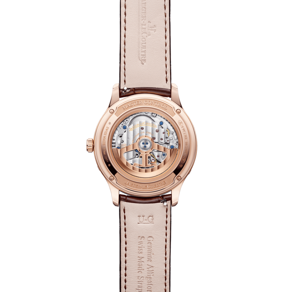 Dans son boîtier de 40 mm en or rose, la nouvelle Master Control Calendar offre à ses complications leur plus beau rôle. Elle donne l’heure mais aussi le calendrier complet, sans oublier son ingénieuse date sautante terminée par une ancre Jaeger-LeCoultre rouge d’une grande finesse. Comme l’indique son nom, cette complication permet à l’indicateur de date de sauter littéralement entre le 15e et le 16e jour du mois, de façon à laisser toute la place à la phase de lune. Dans un guichet à 6h, l’astre de la nuit se dévoile ou se dérobe sur un fond de ciel étoilé bleu nuit.