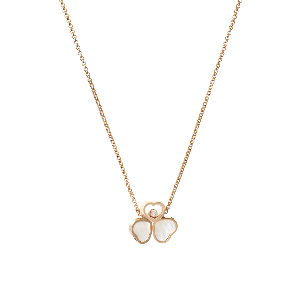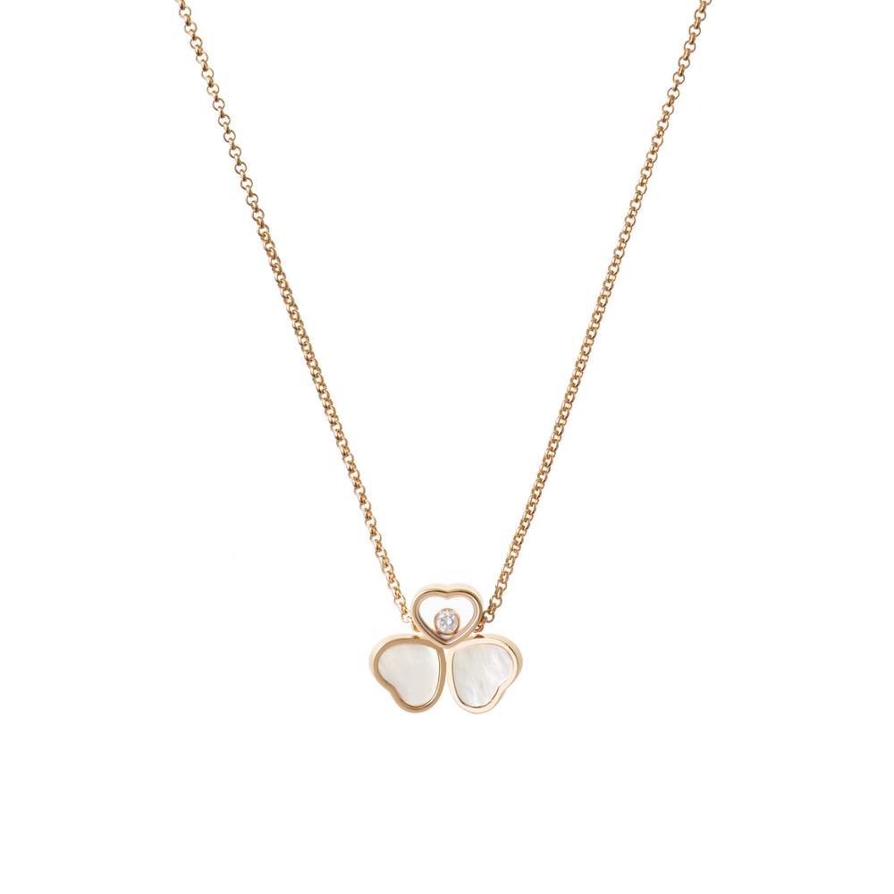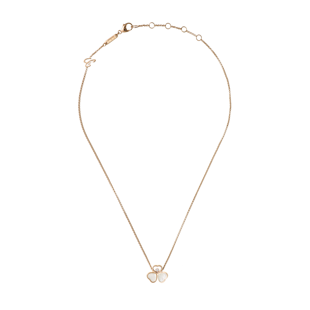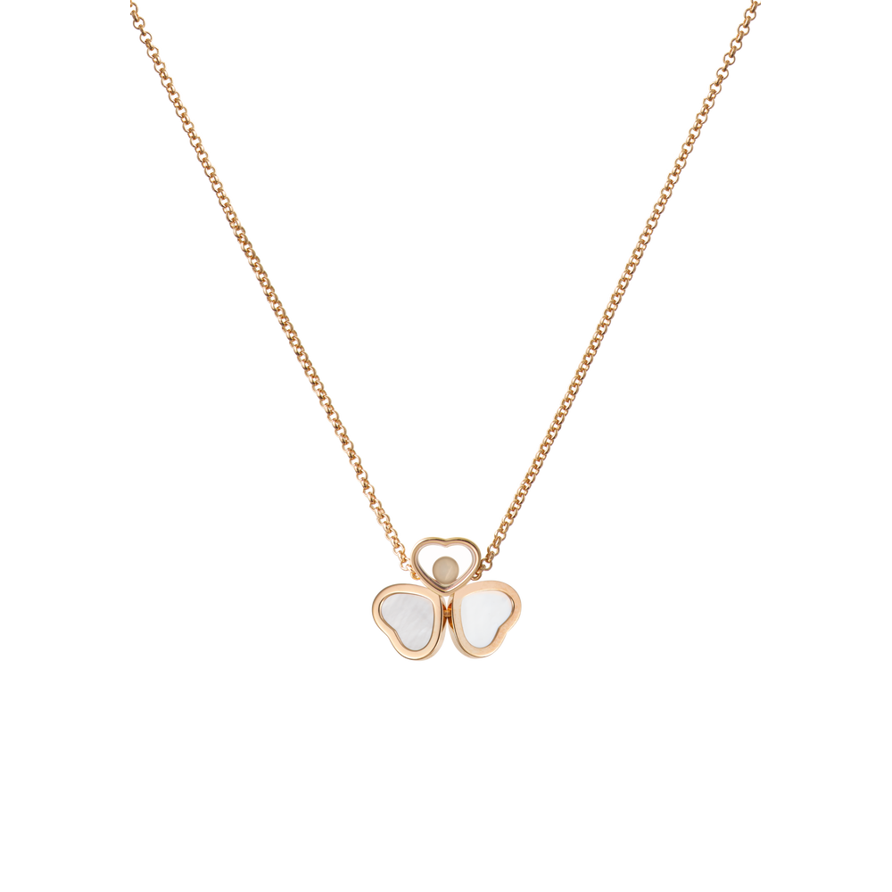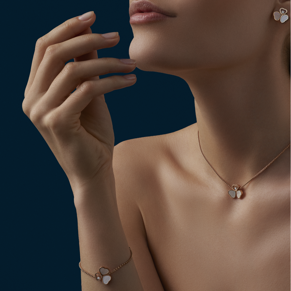 Le papillon, emblème par excellence de légèreté, a soufflé aux colliers en diamant Happy Hearts Wings toute sa délicatesse et sa force symbolique. Il trouve dans les lignes de cette collection de bijoux de luxe un aboutissement d’un grand raffinement, en résonance avec les symboles de la Maison Chopard. Deux cœurs en nacre et or rose, disposés comme des ailes de papillon, sont suspendus à un cœur dans lequel se love un diamant mobile. Little Diamonds Do Great Things