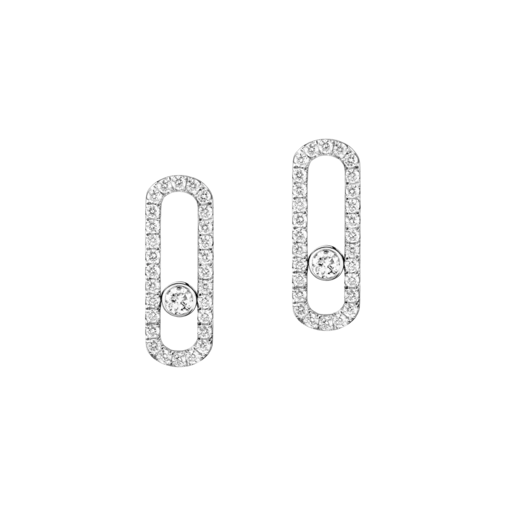 Les boucles d'oreilles pavées diamant Move Uno sont également disponible en or rose et en or jaune.