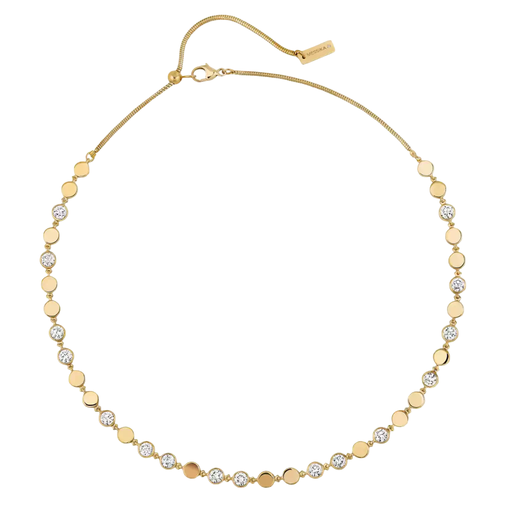 Laissez-vous séduire par le collier D-Vibe, nouvelle collection de joaillerie de la Maison ! Pastilles d'or rose et diamants taille brillant s'alternent dans un effet rythmique pour donner naissance à un collier de luxe ultra-moderne. A porter seul pour un look minimaliste ou en accumulation avec d'autres créations Messika pour un style ultra moderne. On apprécie tout particulièrement son système de fermoir coulissant qui permet de le porter exactement à la longueur souhaitée en fonction de son look du jour.